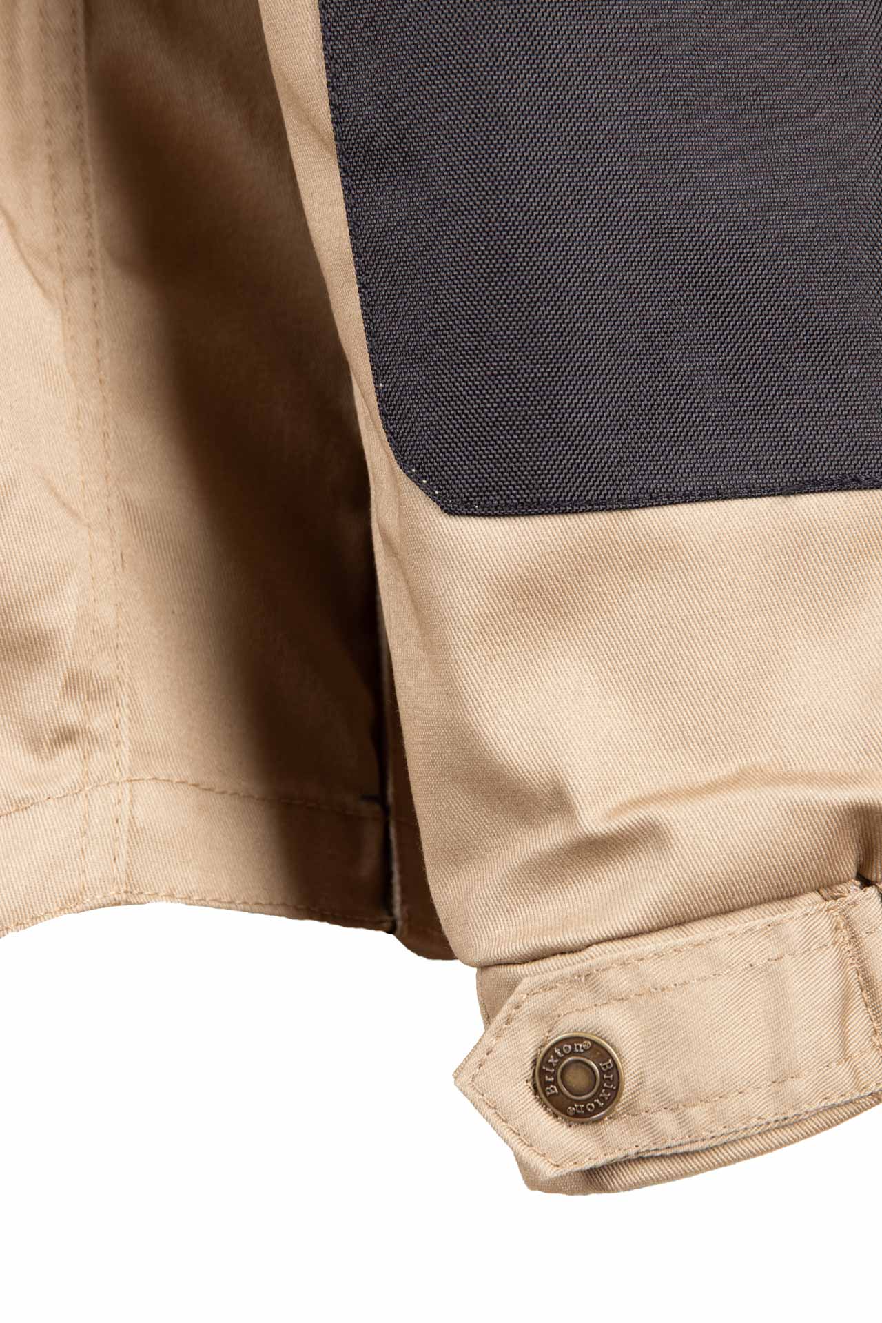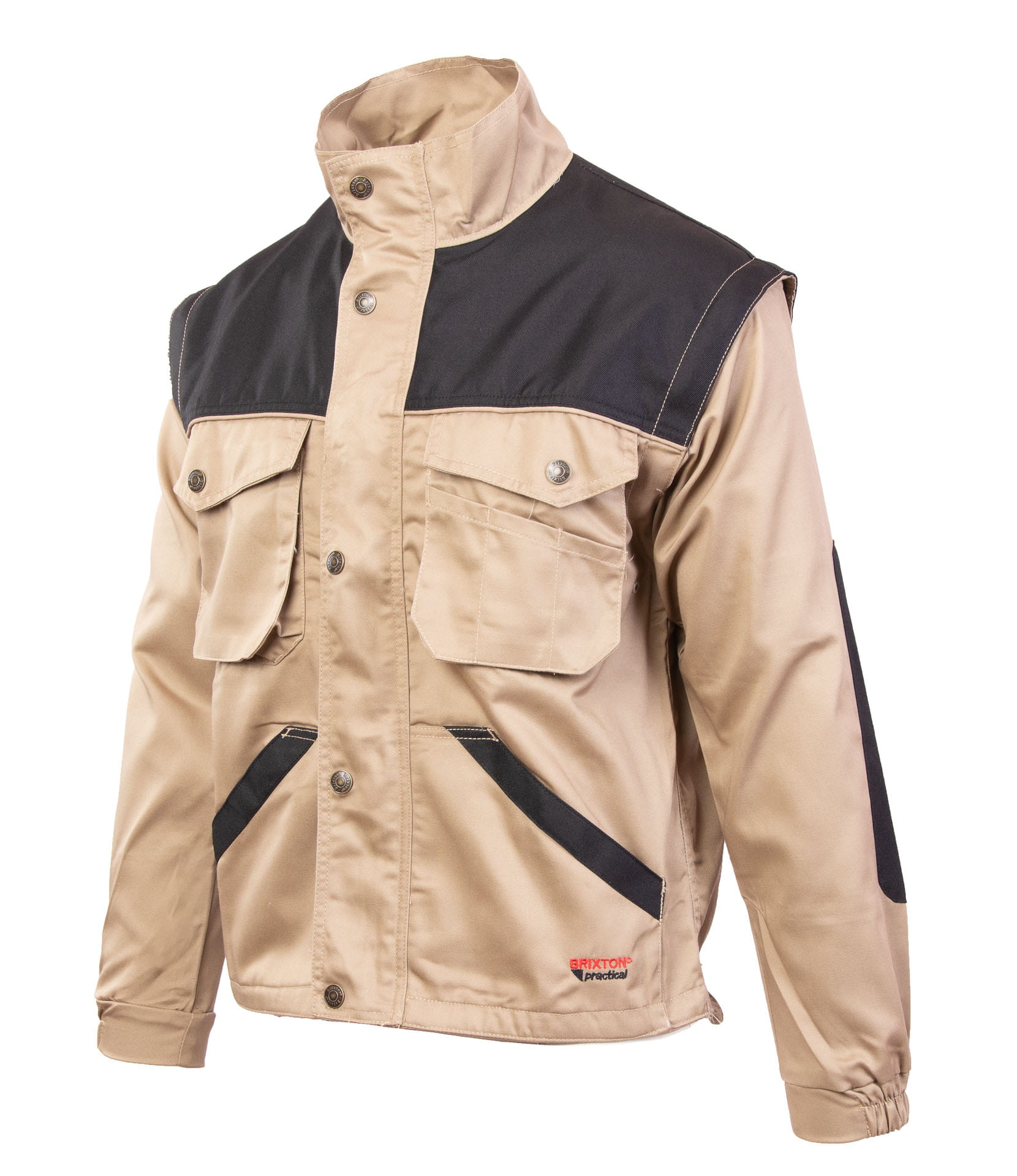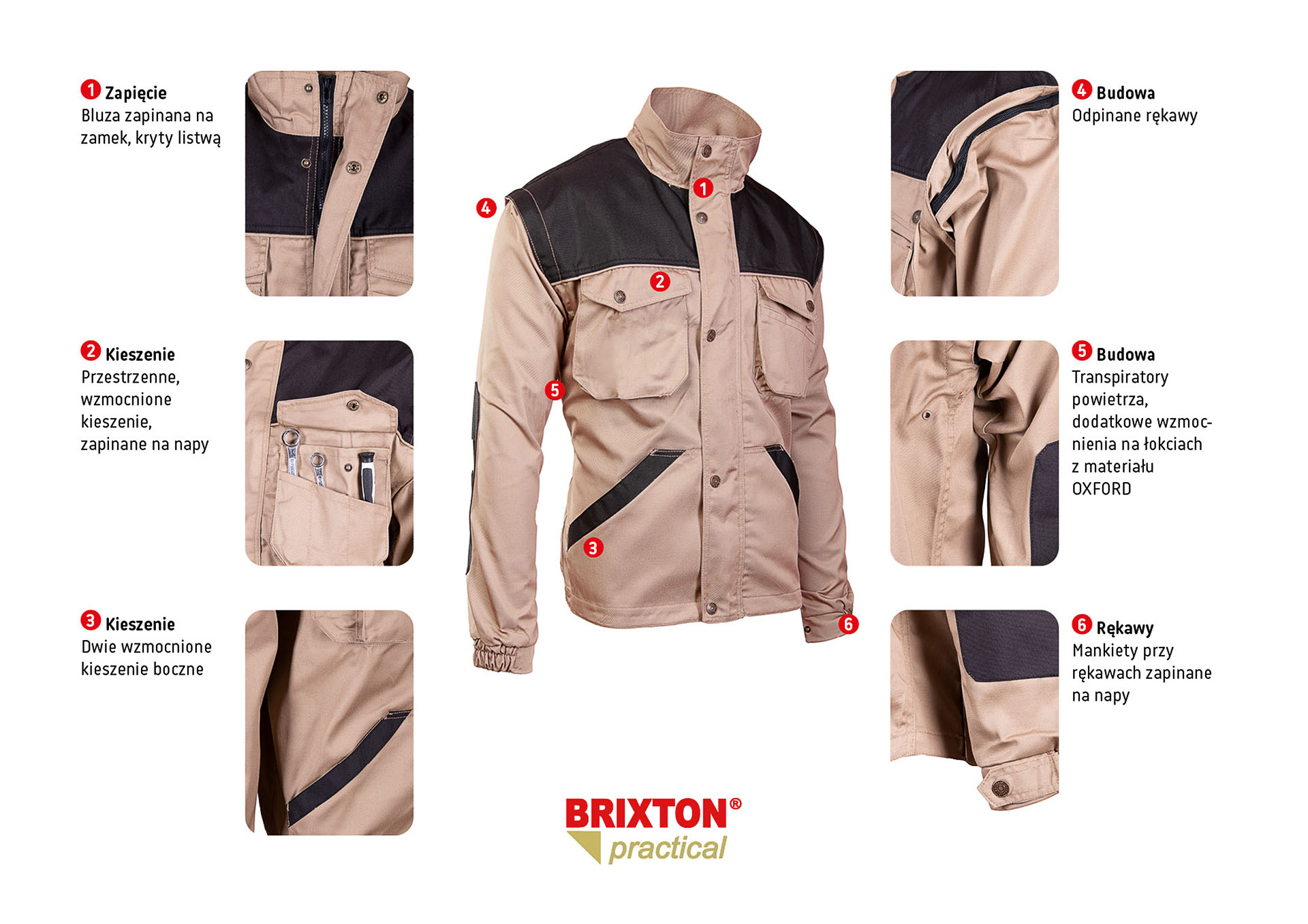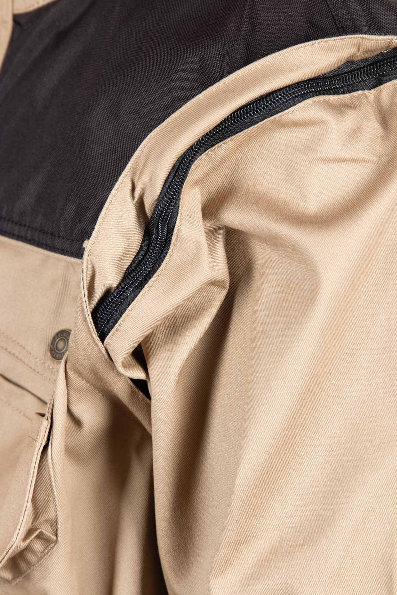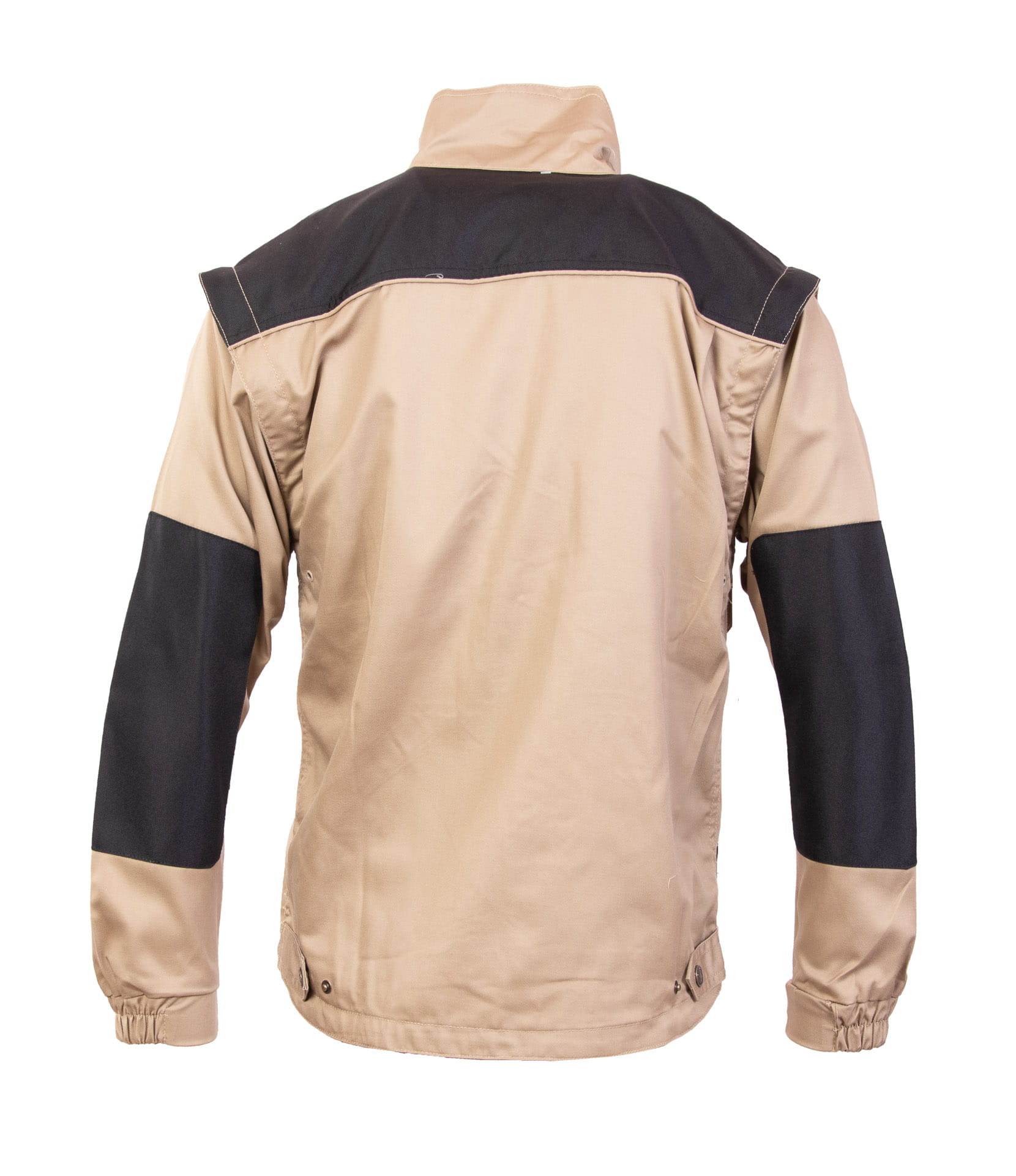 Regulacja obwodu: odpinane rękawy w bluzie beżowej, mankiety przy rękawach zapinane na napy,