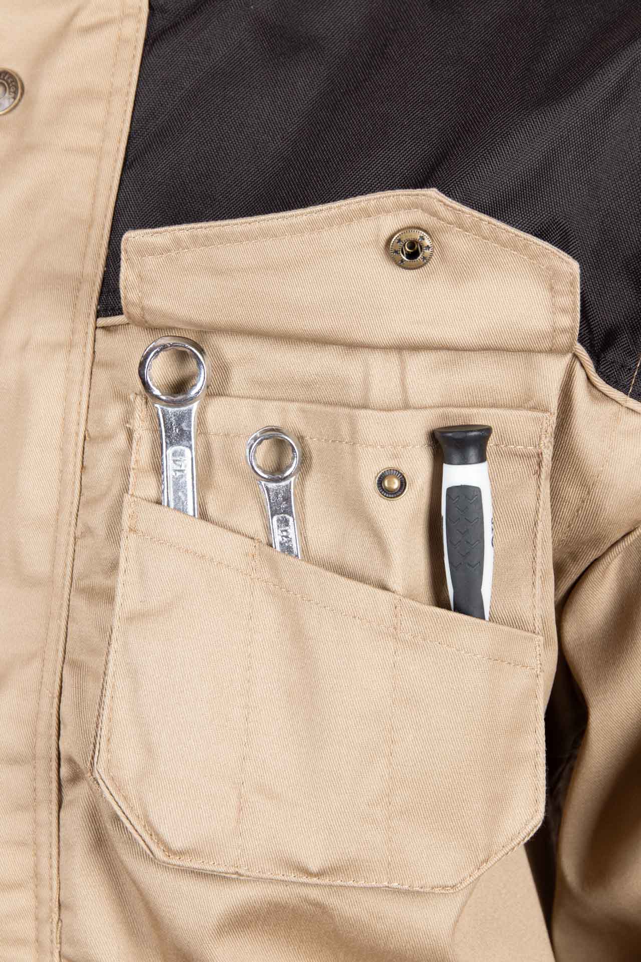 Kieszenie: przestrzenne kieszenie, kieszonka na długopis, dwie kieszenie siateczkowe po wewnętrznej stronie bluzy, wzmocnione kieszenie zapinane na napy, dwie wzmocnione kieszenie boczne,