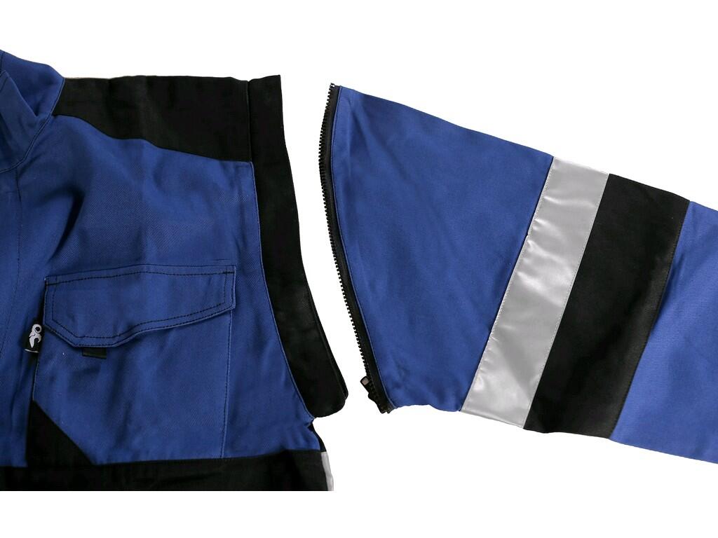Męska bluza robocza wstawi odblask, odpinane rękawy z elastycznym mankietem, kryte zapięcie na zamek i rzepy, kieszenie na piersi z patkami, ukryta kieszeń na piersi na zamek, zwykłe kieszenie boczne, dolna część na bokach z wszytą gumą, paski odblaskowe.
