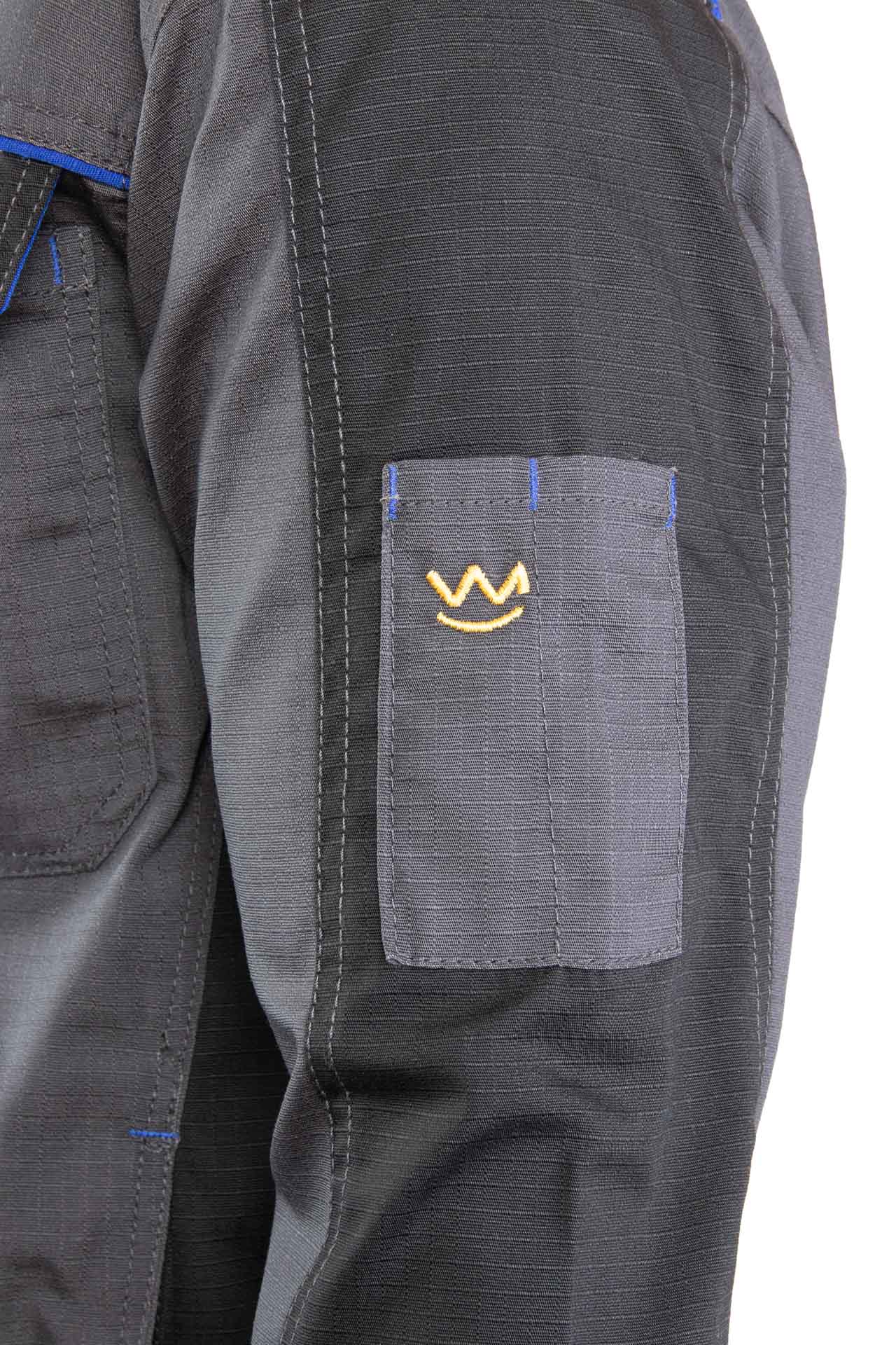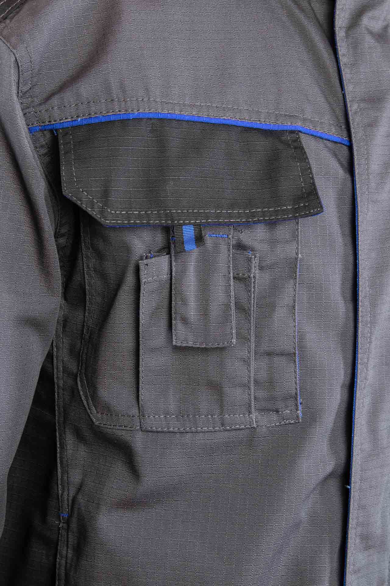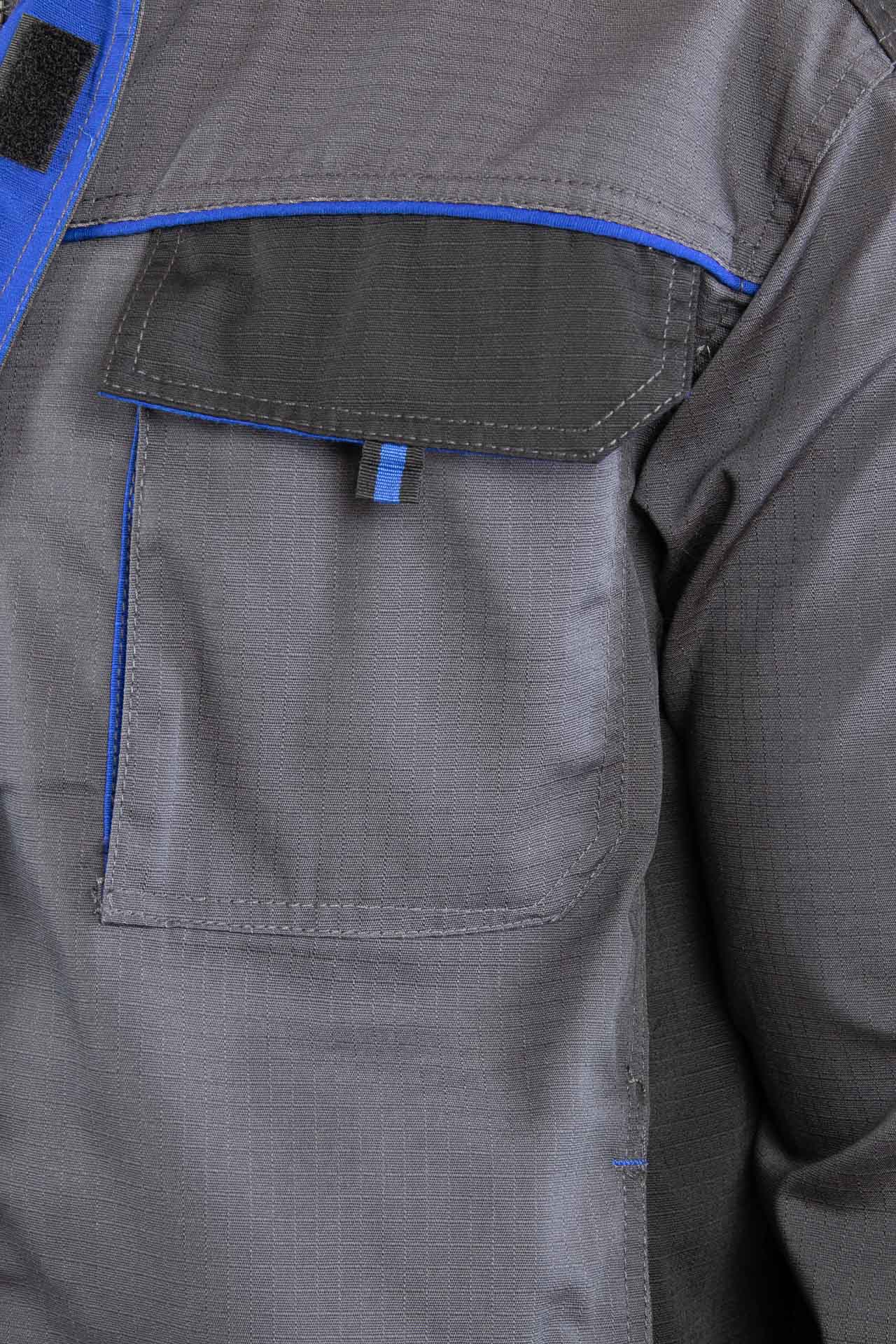 Bluza posiada funkcjonalny układ kieszeni, który ułatwia organizację narzędzi. Znajdziesz tu dwie górne kieszenie kryte listwą zapinaną na rzep, a także kieszeń na klatce piersiowej oraz dwie kieszenie boczne zapinane na zamek. Ten układ zwiększa funkcjonalność bluzy i poprawia komfort pracy.