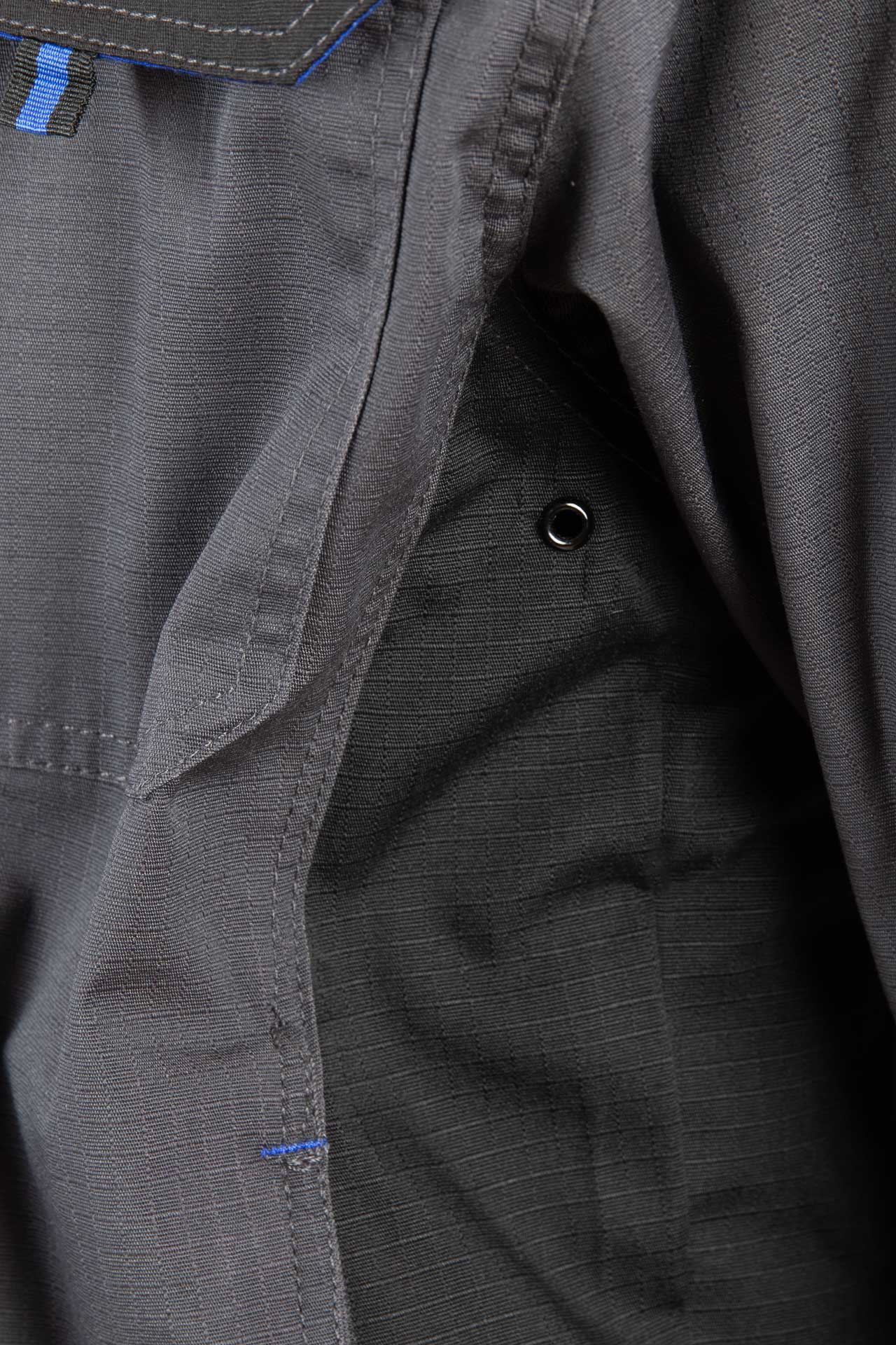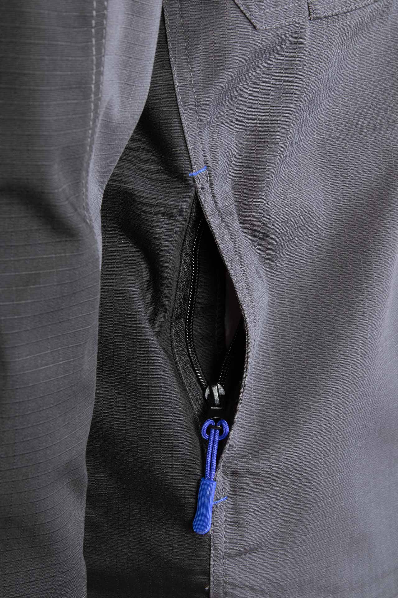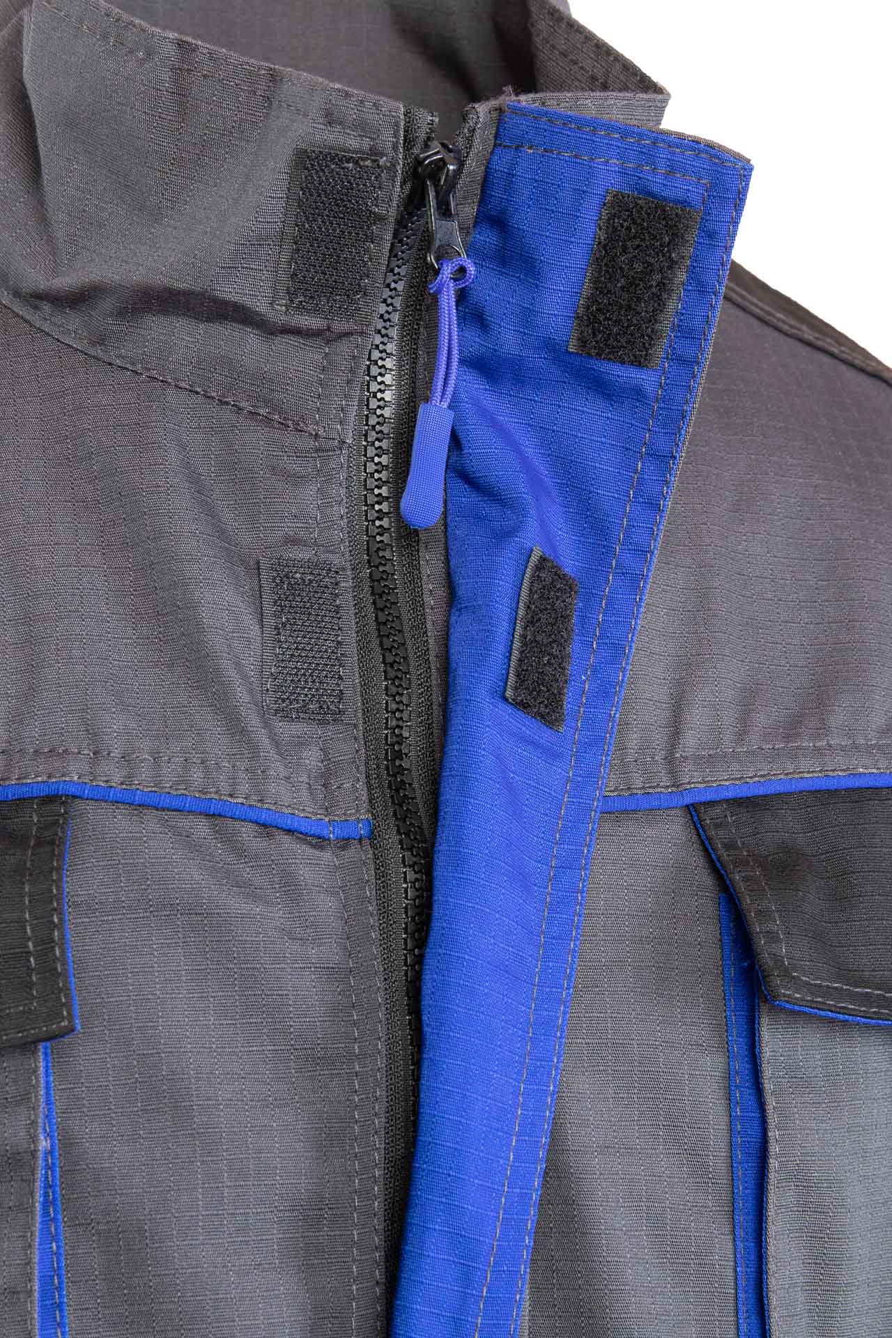 Bluza posiada funkcjonalny układ kieszeni, który ułatwia organizację narzędzi. Znajdziesz tu dwie górne kieszenie kryte listwą zapinaną na rzep, a także kieszeń na klatce piersiowej oraz dwie kieszenie boczne zapinane na zamek. Ten układ zwiększa funkcjonalność bluzy i poprawia komfort pracy.