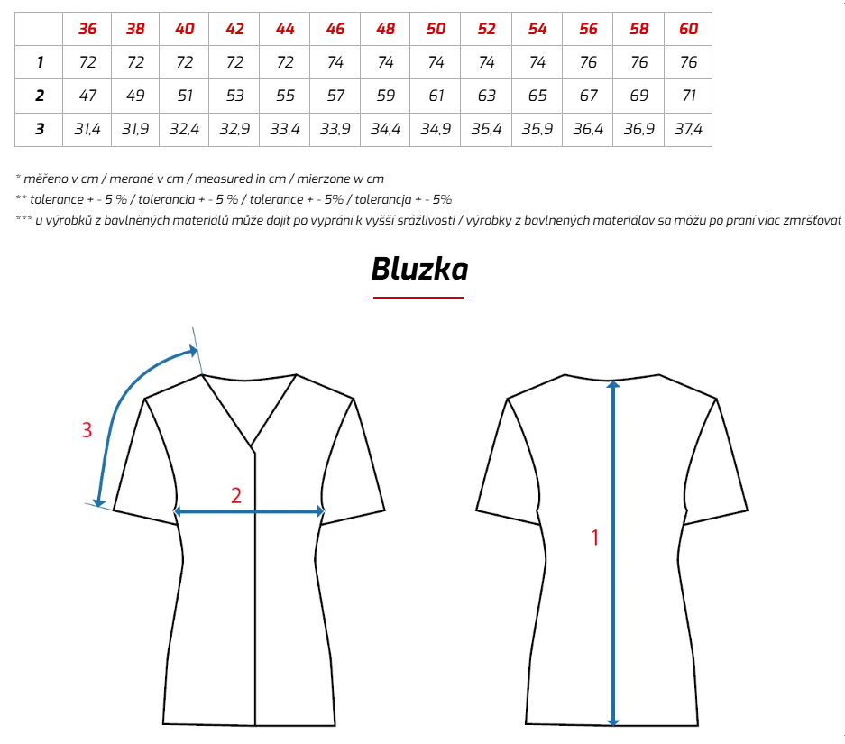 Model wyposażono w trzy praktyczne kieszenie – jedną kieszeń na piersi z dodatkową przegródką na ołówek oraz dwie pojemne kieszenie dolne. Dzięki temu bluzka umożliwia wygodne przechowywanie drobnych akcesoriów niezbędnych podczas pracy.