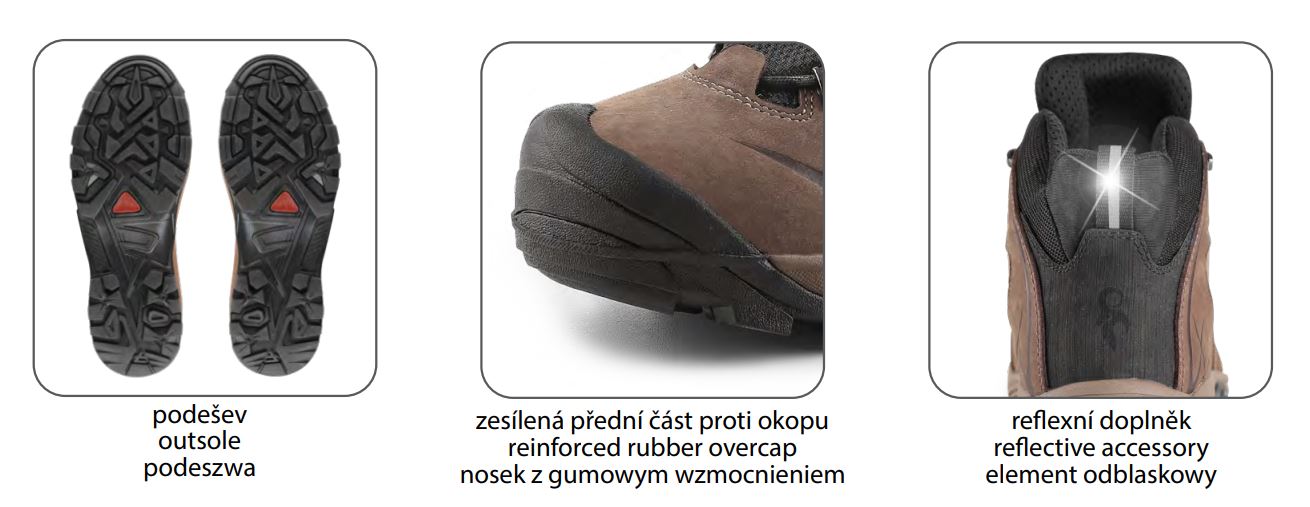 Materiał: cholewka ze skóry licowej o grubości 1,5mm i skóry szlifowanej o grubósci 1,3mm, nosek i pięta z gumowym wzmocnieniem, kołnierz z siatki, tekstylna podszewka kombinowana z wodoodporną membraną CX-SHIELD z folią TPU, podeszwa: EVA/guma.