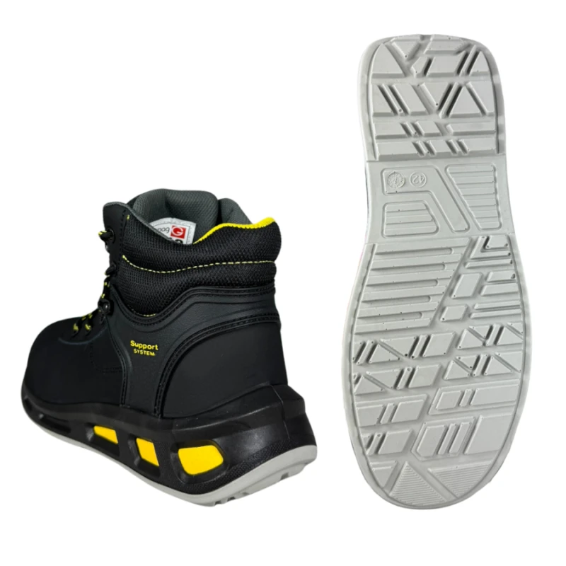 Za komfort i stabilność odpowiada podeszwa z poliuretanu PU i TPU – elastyczna, amortyzująca i wzbogacona o dynamiczne wstawki POPCORN, które zwiększają wygodę użytkowania. Obuwie posiada również właściwości antystatyczne, absorpcję energii w części piętowej (E) oraz antypoślizgową powierzchnię SRC, zapewniając pewność kroków na różnych nawierzchniach.