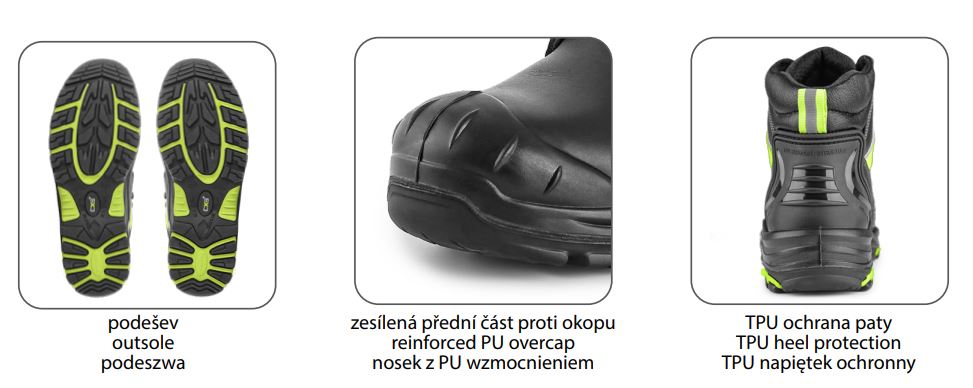 Podeszwa: PU/guma, przeciwpoślizgowa, antystatyczna, olejoodporna, odporna na przebicie oraz na ciepło kontaktowe do 300°C
