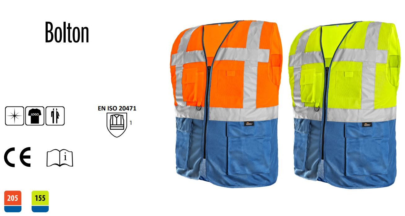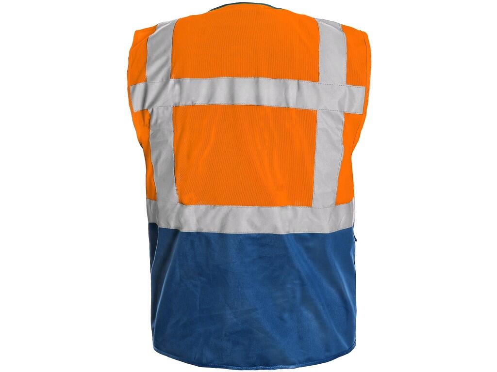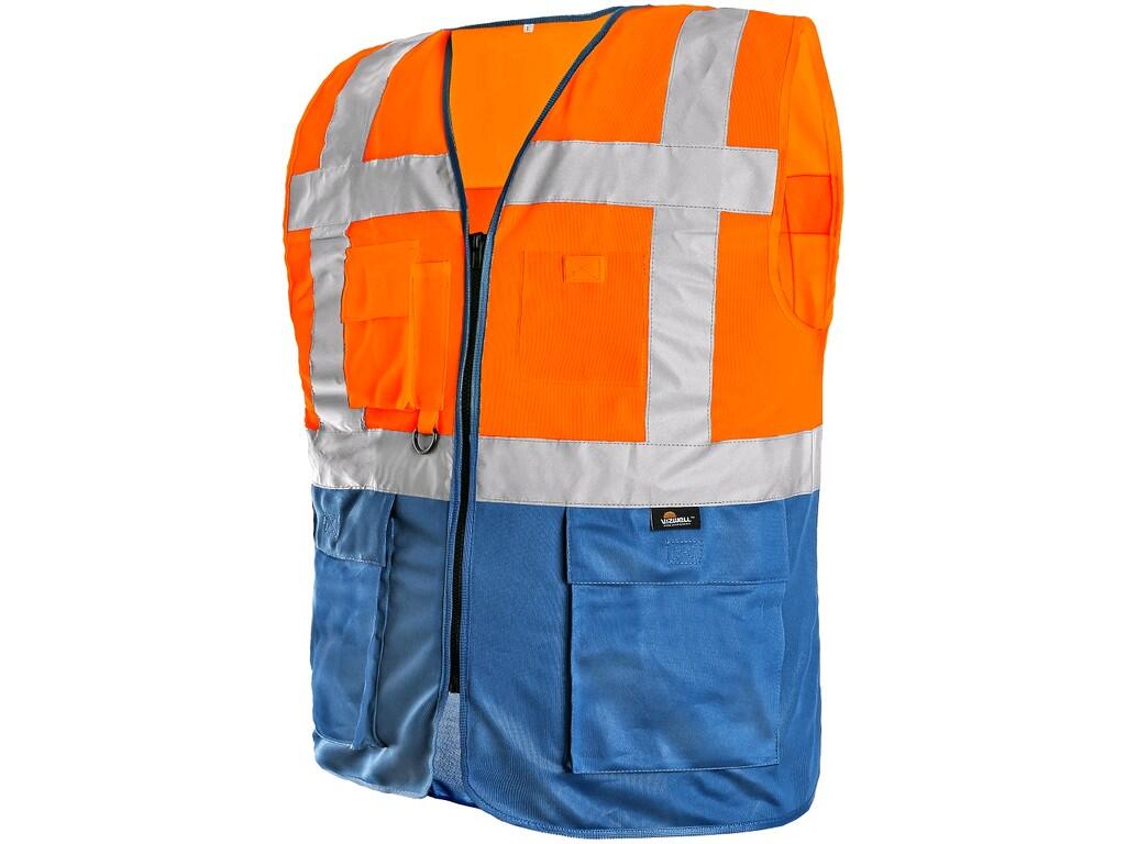 Ostrzegawcza dwukolorowa kamizelka zapinana na zamek, 2 dolne kieszenie z klapami, w prawym górnym rogu kieszeń na komórkę i ołówek, mozliwosć dołączyć dowód osobisty, na lewej stronie przezroczysta kieszeń na dowód osobisty, paski odblaskowe wokół ciała i przes ramiona. Nowoczesny i wielofunkcyjny design zapewnia bezpieczeństwo, komfort i praktyczność. Niebieski kolor w dolnej części kamizelki chroni przed widocznym zanieczyszczeniem.