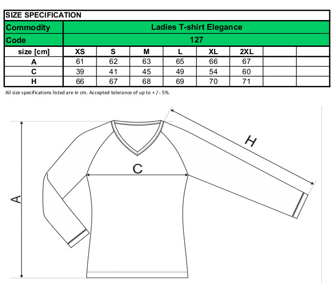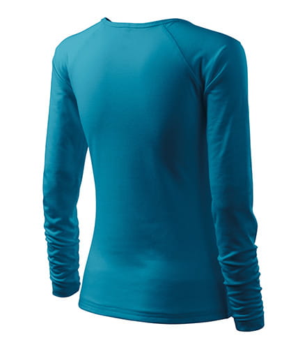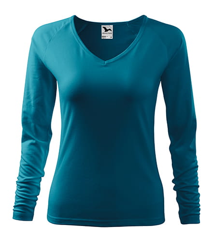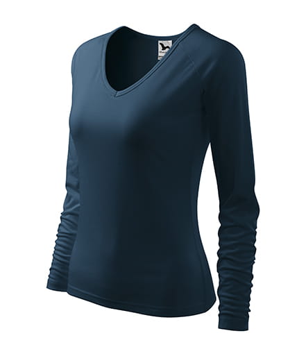 Wysokiej jakości koszulka damska o wysokiej gramaturze. Wycięcie w kształcie litery „V”. Długi rękaw raglanowy.