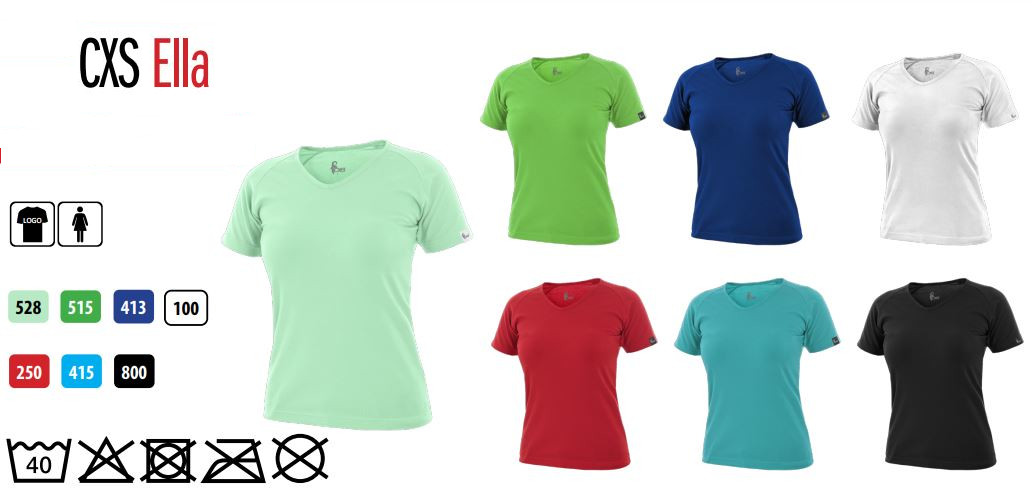 V dekolt, krótkie rękawy raglanowe. Krój podkreślający kobiecą sylwetkę, z dodatkiem elastanu dla lepszej elastyczności i dla utrzymania kształtu. Wykończenie silikonowe zapewnia wyższą miękkość i odporność na zabrudzenia. Satynowa etykieta wewnętrzna. Nadaje się do nadruku i haftu.