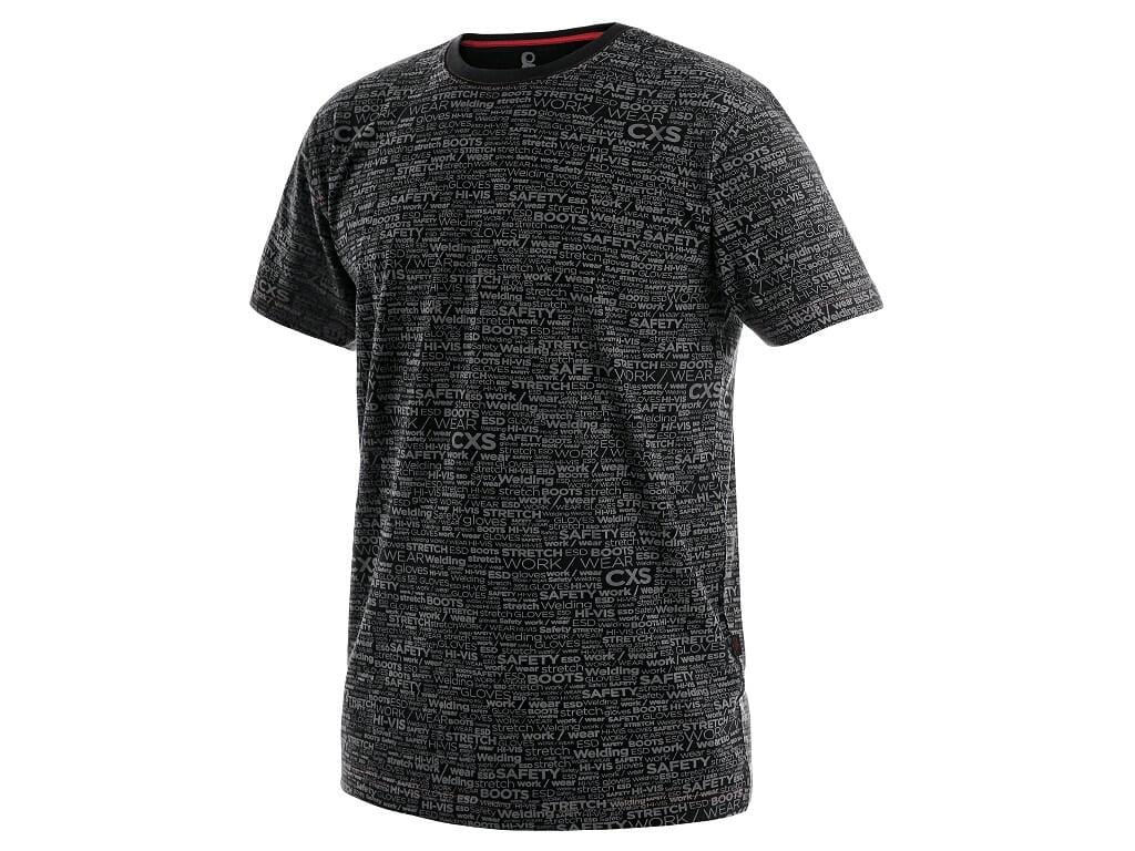 Okrągły dekolt. Czerwone szwy na rękawach i z dołu koszulki. Dekolt z wzmacniającym paskiem w kolorze szarym/czerwonym. Podrukowana tkanina, wykończenie silikonowe zapewnia trwałość rozmiarową i redukuje pilling.