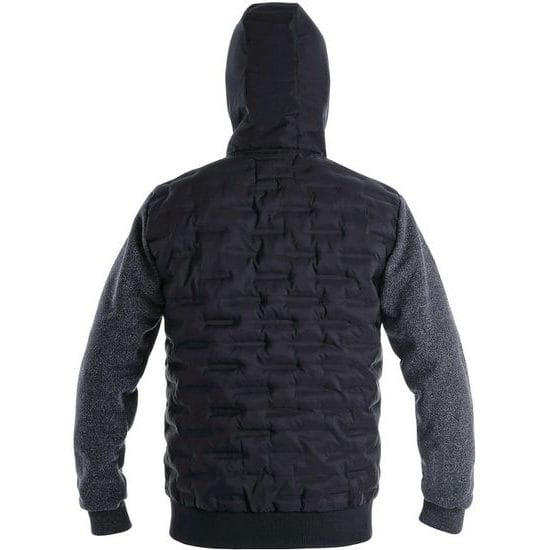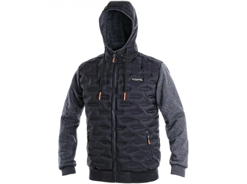 Męska modna kurtka/bluza, kombinacja materiałów, ocieplana z przodu i z tyłu, kaptur nieodpinany, 2 boczne kieszenie zapinane na zamek, kontrastowe elementy, pas i rękawy zakończone elastycznym mankietem.