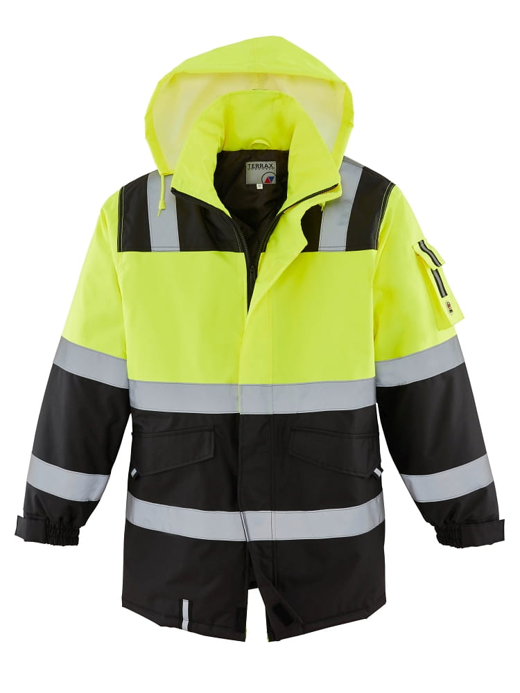 Męska parka o dużej widoczności Gotowa na każde wyzwanie: nasza dwukolorowa, watowana parka firmy Terrax Workwear. Posiada certyfikat EN ISO 343 i EN ISO 20471 klasa 2, z odblaskowymi paskami zapewniającymi maksymalną widoczność w warunkach słabego oświetlenia. Praktyczne funkcje, takie jak kieszeń na telefon komórkowy na rękawie, ukryty zamek błyskawiczny z przodu i kieszenie z rozcięciami, sprawiają, że ta parka jest idealnym towarzyszem w świecie pracy. Elastyczne mankiety z możliwością regulacji szerokości zapewniają dodatkowy komfort i ochronę.