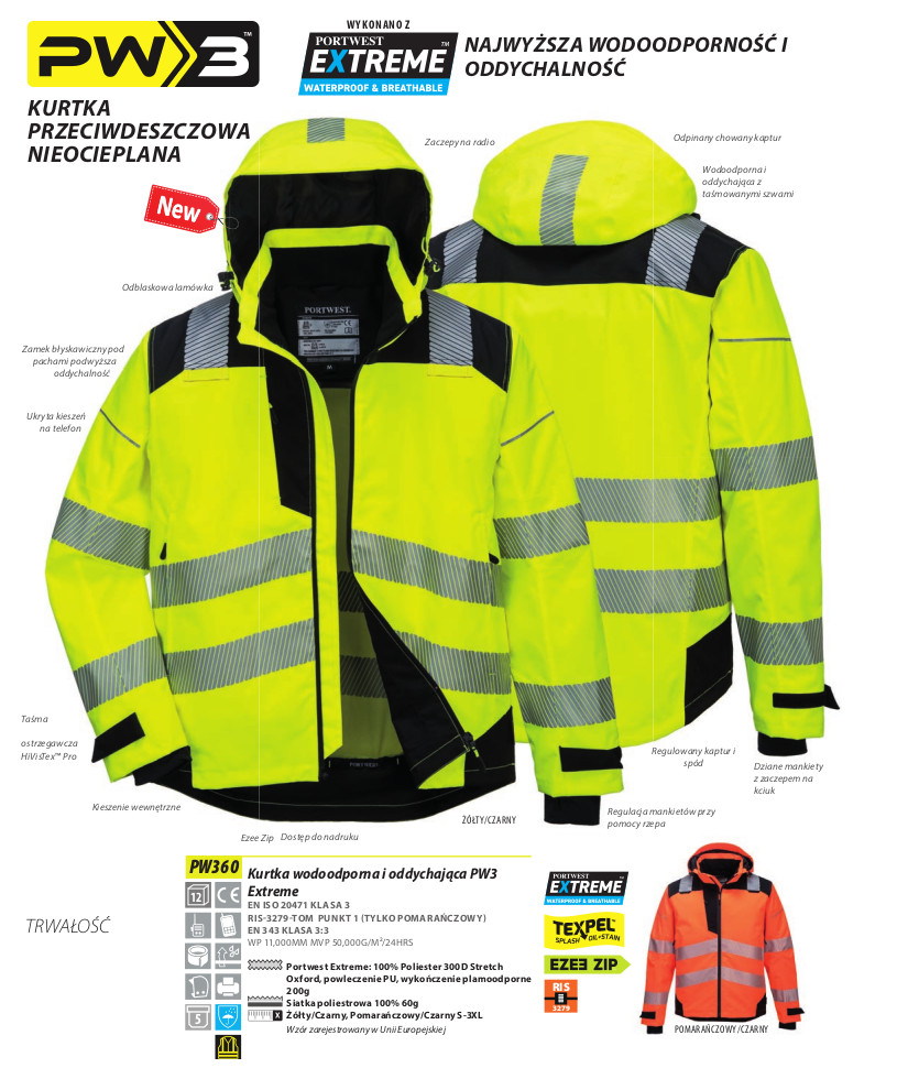 Doskonale zaprojektowana kurtka ostrzegawcza PW3 z taśmą HiVisTex Pro oferująca wyjątkową swobodę ruchów. Zastosowano w niej wodoodporną tkaninę wierzchnią poliester rip stop oraz bardzo lekką ocieplinę Insulatex. Dzięki temu może być stosowana w czasie pracy w zmiennych warunkach pogodowych. Posiada kieszenie zapinane na zamki błyskawiczne oraz zapięcie przednie na zamek Ezee.