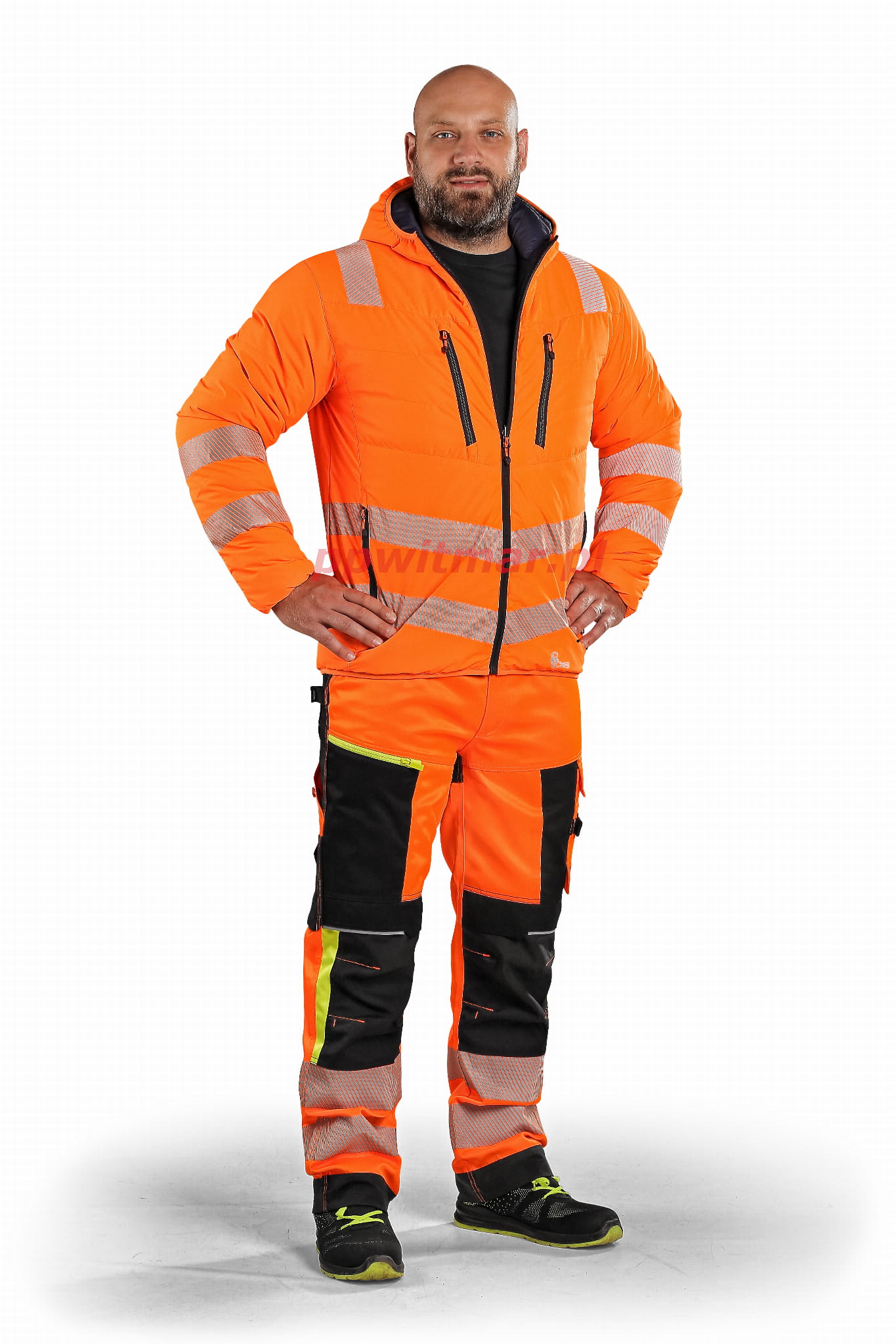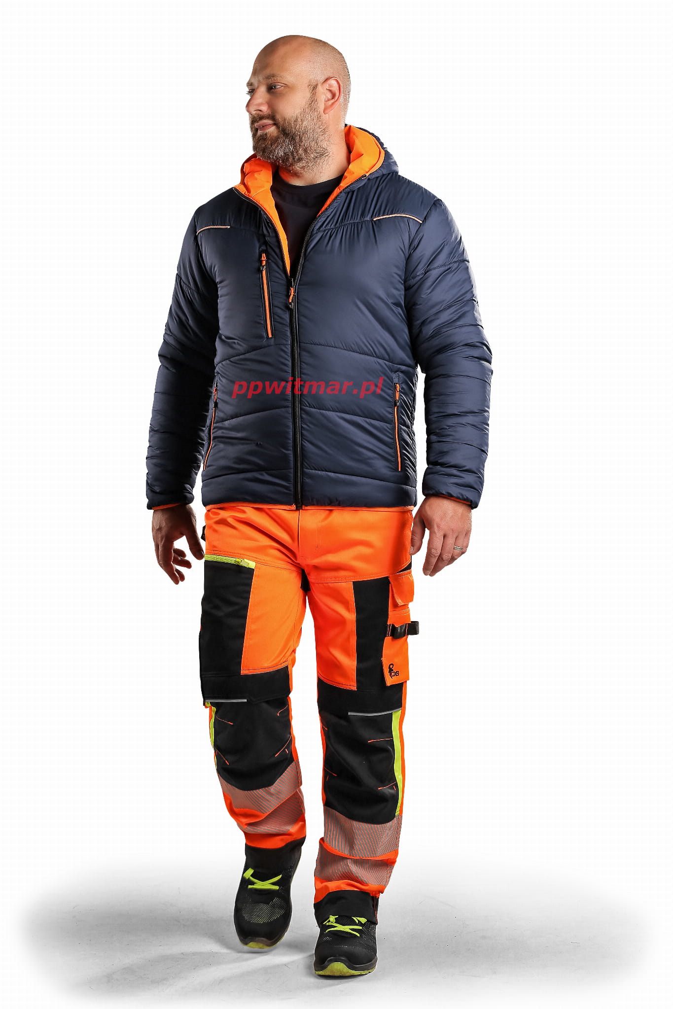 Zewnętrzna część: kieszenie na piersi na zamek, boczne kieszenie na zamek i segmentowe paski odblaskowe.