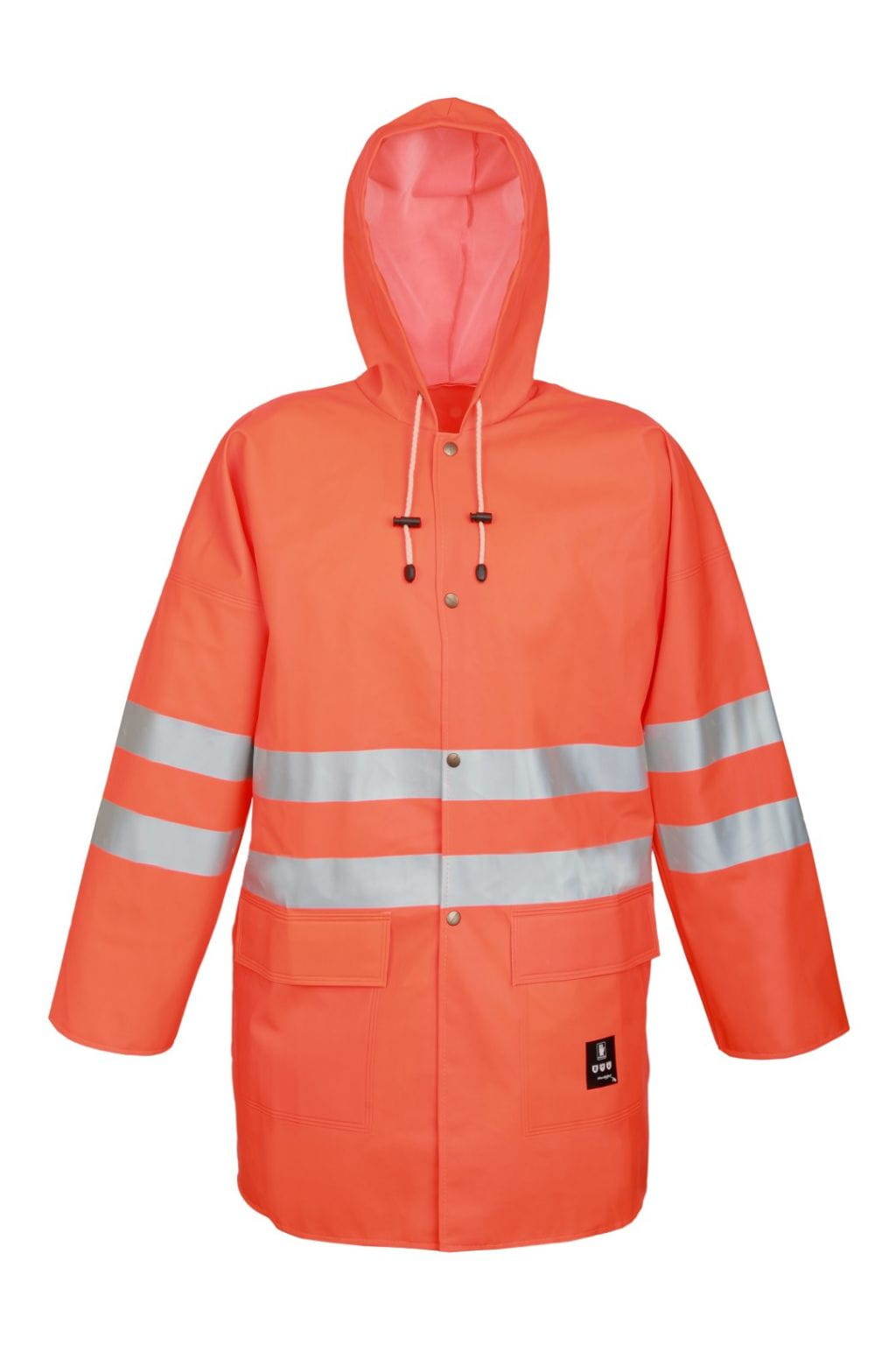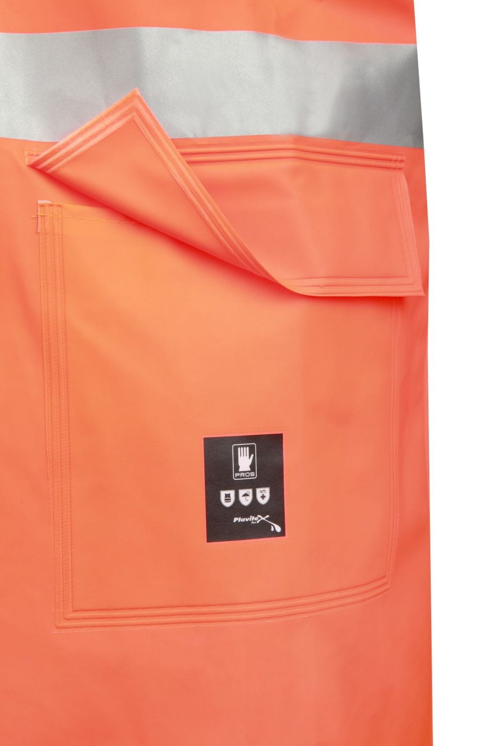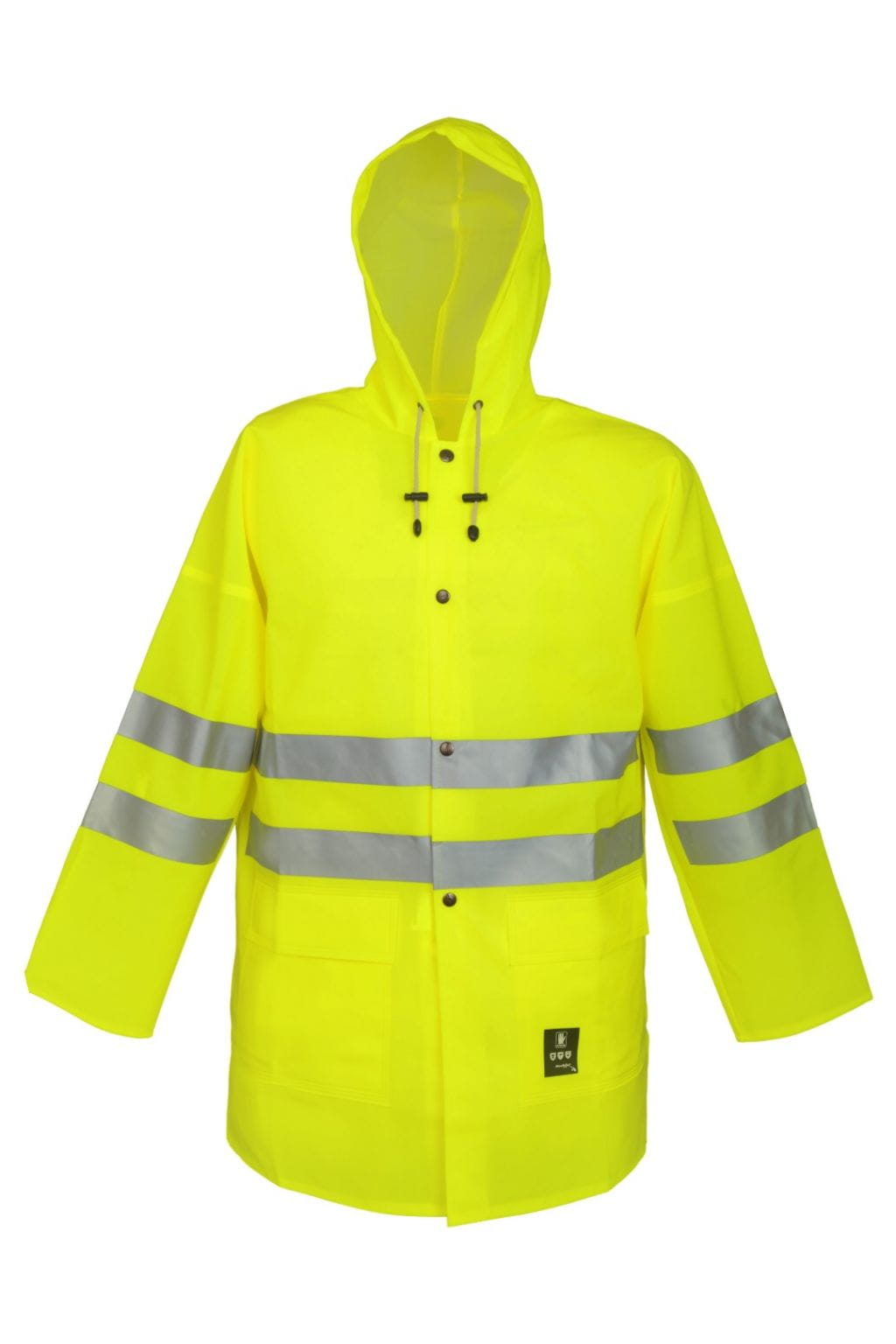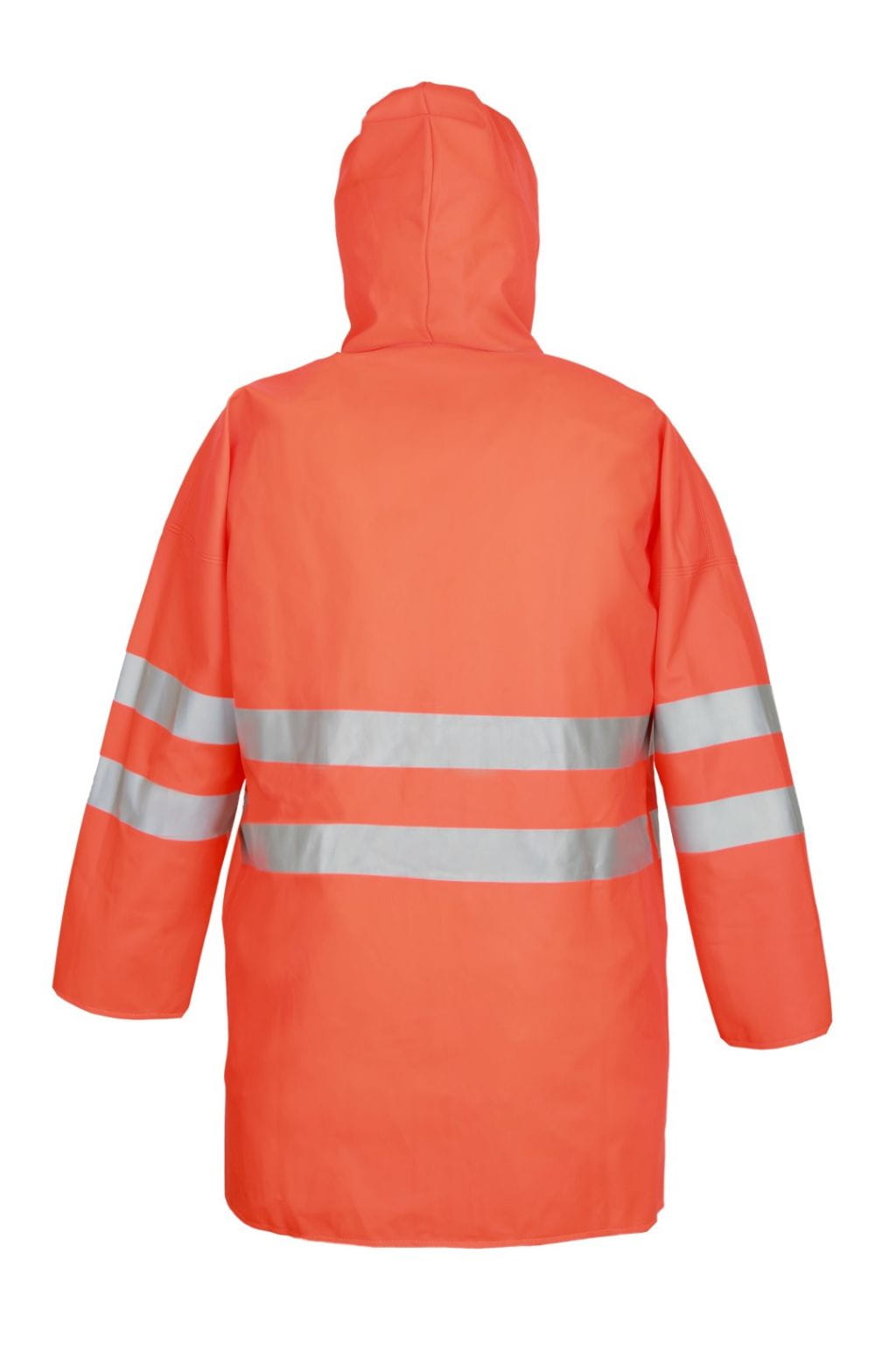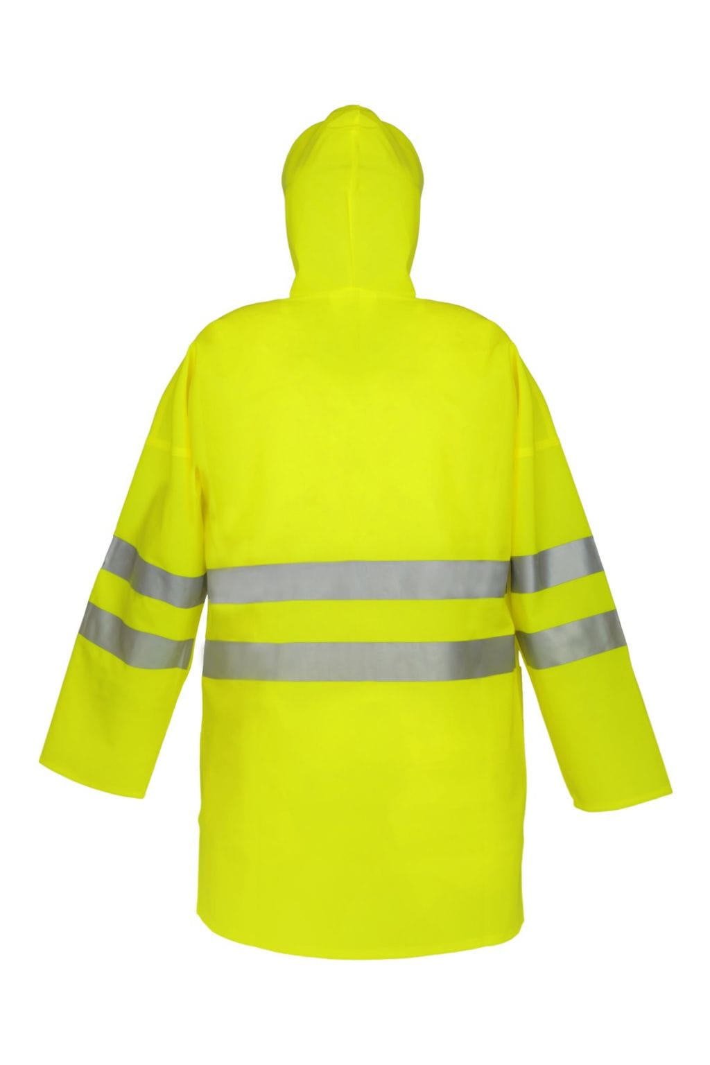 Zapinana na napy, z kapturem i dwiema bocznymi kieszeniami przykrytymi patkami. Posiada taśmę ostrzegawczą zwiększającą widzialność pracownika. Model produkowany z wodoochronnej tkaniny Plavitex Fluo, przeznaczony do użytku w niesprzyjających warunkach pogodowych, kiedy widoczność jest ograniczona. Zapewnia skuteczną ochronę przed wiatrem i deszczem. Technika obustronnego zgrzewania zwiększa wytrzymałość szwów. Produkt spełnia standardy europejskich norm: EN ISO 13688, EN 343 i EN ISO 20471.