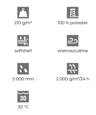 | Materiał: | Softshell, 100 % poliester, oddychająca membrana, 100 % poliester wodoodporność 5000 mm, oddychalność 2 000 g/m²/24 godz softshell |