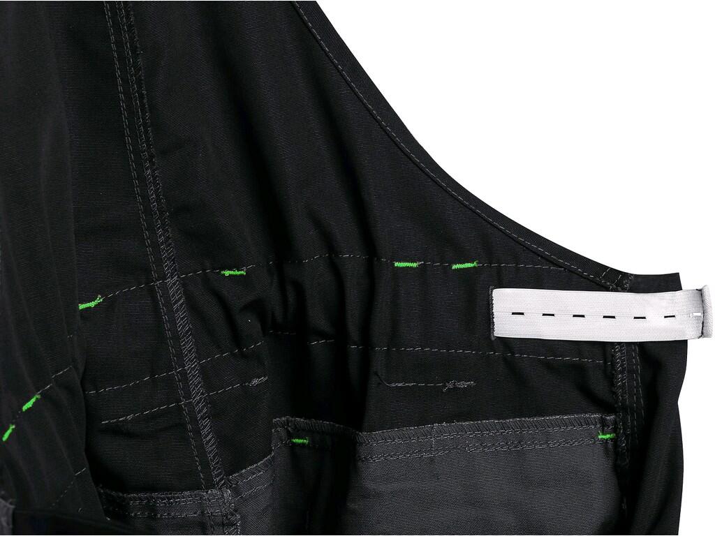 Przednie kieszenie klinowe oraz wielofunkcyjne kieszenie z obu stron gwarantują wystarczającą ilość miejsca na przechowanie niezbędnych akcesoriów. Wzmocnione kolana z poliestru 600D zapewniają ochronę w miejscach szczególnie narażonych na uszkodzenia, a możliwość włożenia nakolanników dodatkowo zwiększa komfort pracy w wymagających warunkach. Dwóch kieszeni z patkami pozwala na przechowywanie większych przedmiotów, a wzmocnione brzegi nogawek poliestrem 600D chronią przed przetarciami.