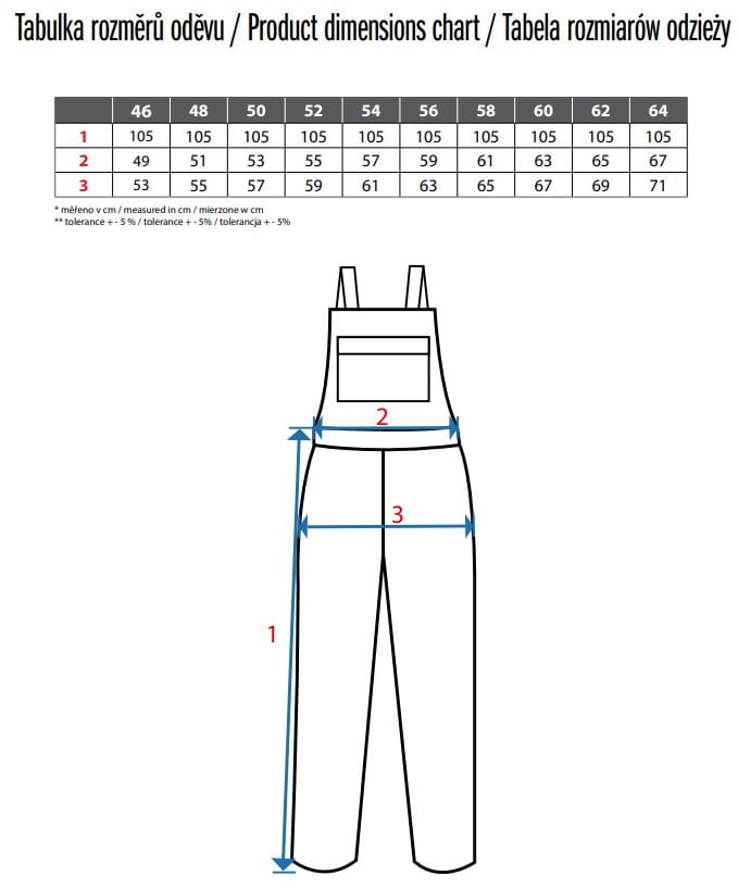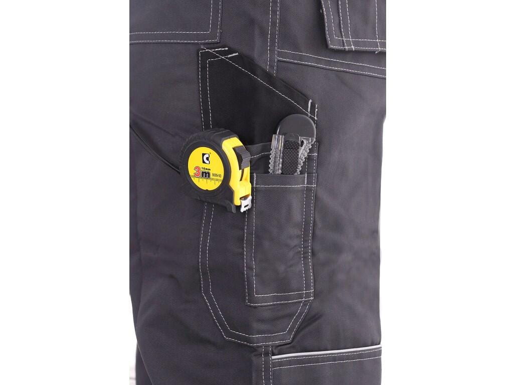 Kieszenie na piersi z klapką, pas ze szlufkami na pasek, z tyłu wszyta guma, przednie kieszenie ze szlufkami na narzędzia, kieszenie wielofunkcyjne z obu stron, kolana wzmocnione poliestrem 600D z możliwością włożenia nakolanników, dwie tylne kieszenie, jedna na rzep, szelki z gumą w tyle, elementy odblaskowe.