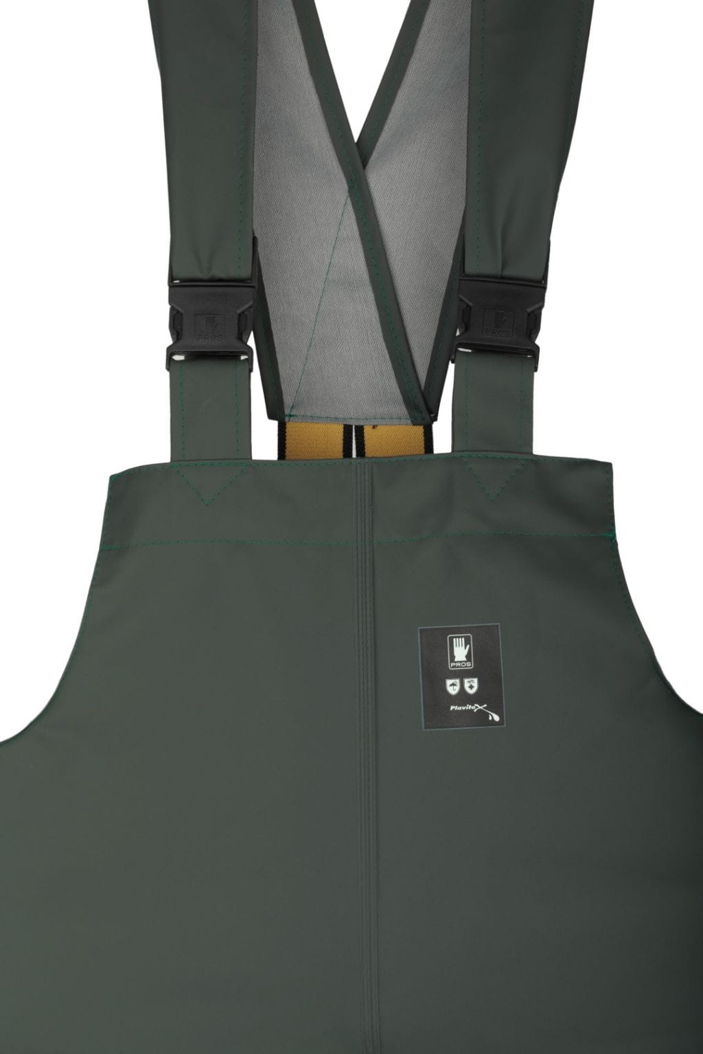 Funkcjonalność modelu podnoszą regulowane szelki oraz wygodne zapięcie, które ułatwia zakładanie spodni. Dodatkowe wzmocnienia na kolanach zwiększają odporność na przetarcia podczas pracy w pozycji klęczącej. Wysoki przód skutecznie chroni brzuch użytkownika przed przemoczeniem, co jest szczególnie ważne podczas pracy na mokrym podłożu.