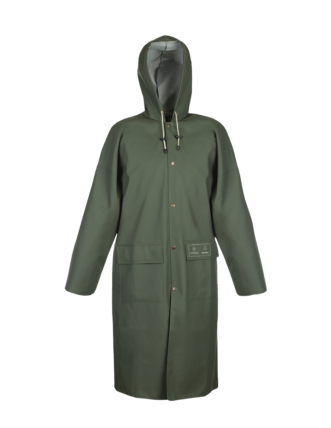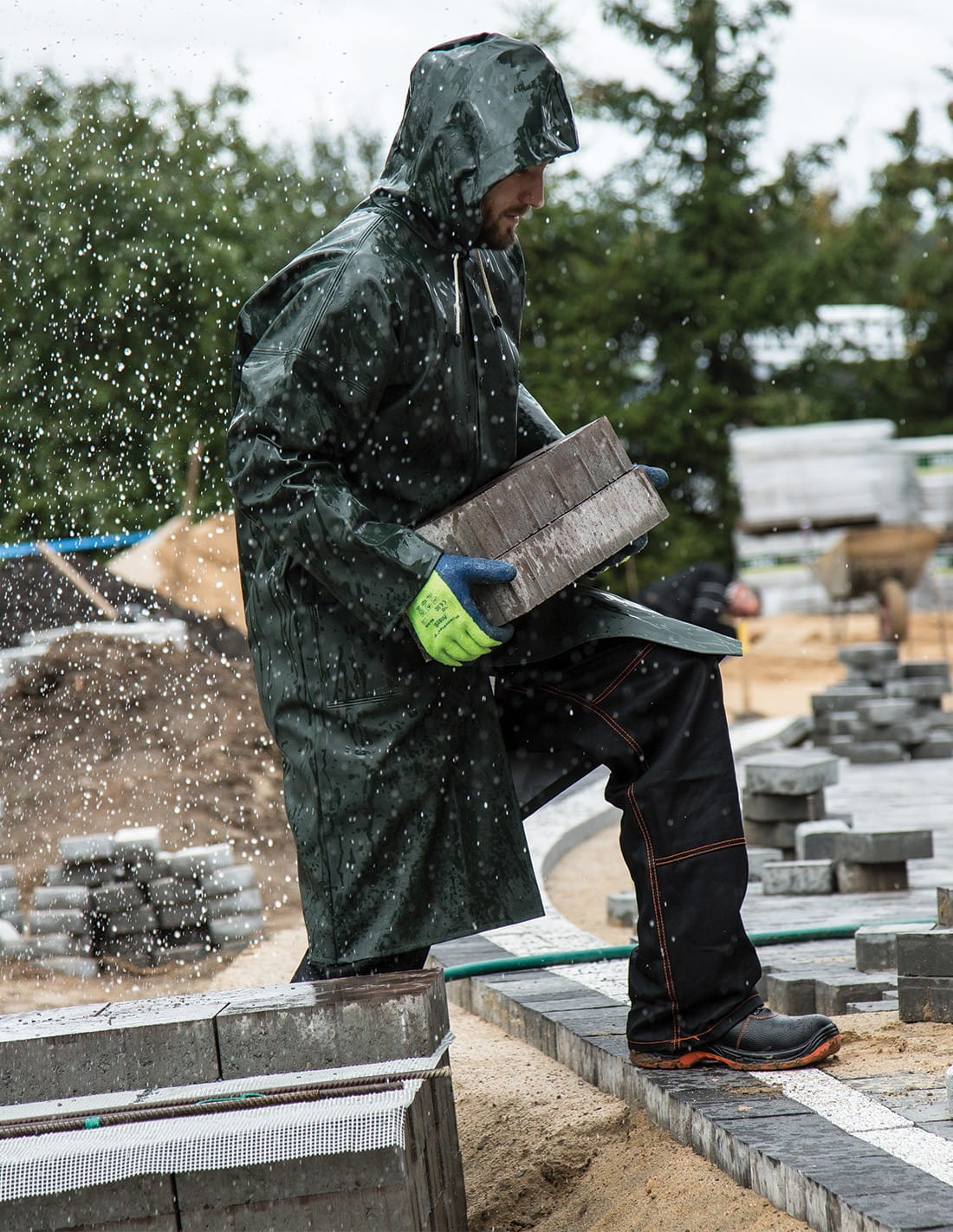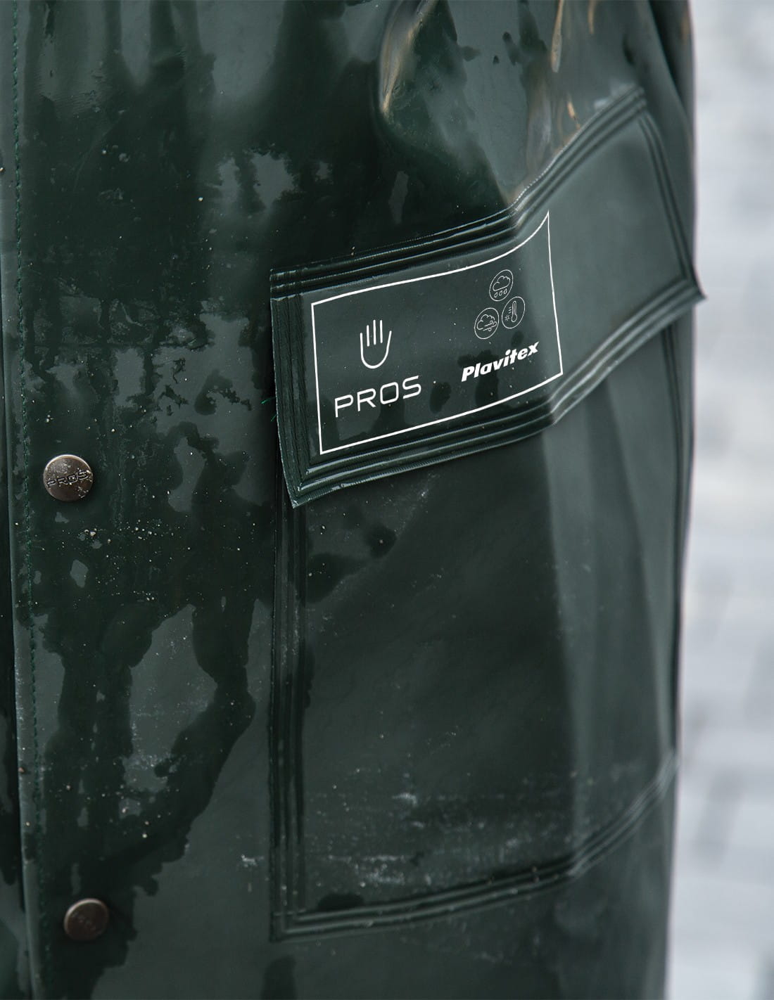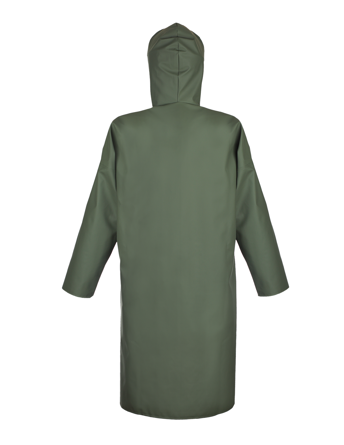 Zwiększona długość chroni uda i kolana przed przemoczeniem. Płaszcz zapinany na napy, z kapturem i dwiema bocznymi kieszeniami przykrytymi patkami. Model produkowany z wodoochronnej tkaniny Plavitex, przeznaczony do użytku w niesprzyjających warunkach pogodowych. Zapewnia skuteczną ochronę przed wiatrem i deszczem. Technika obustronnego zgrzewania zwiększa wytrzymałość szwów. Produkt spełnia standardy europejskich norm: EN ISO 13688 i EN 343.