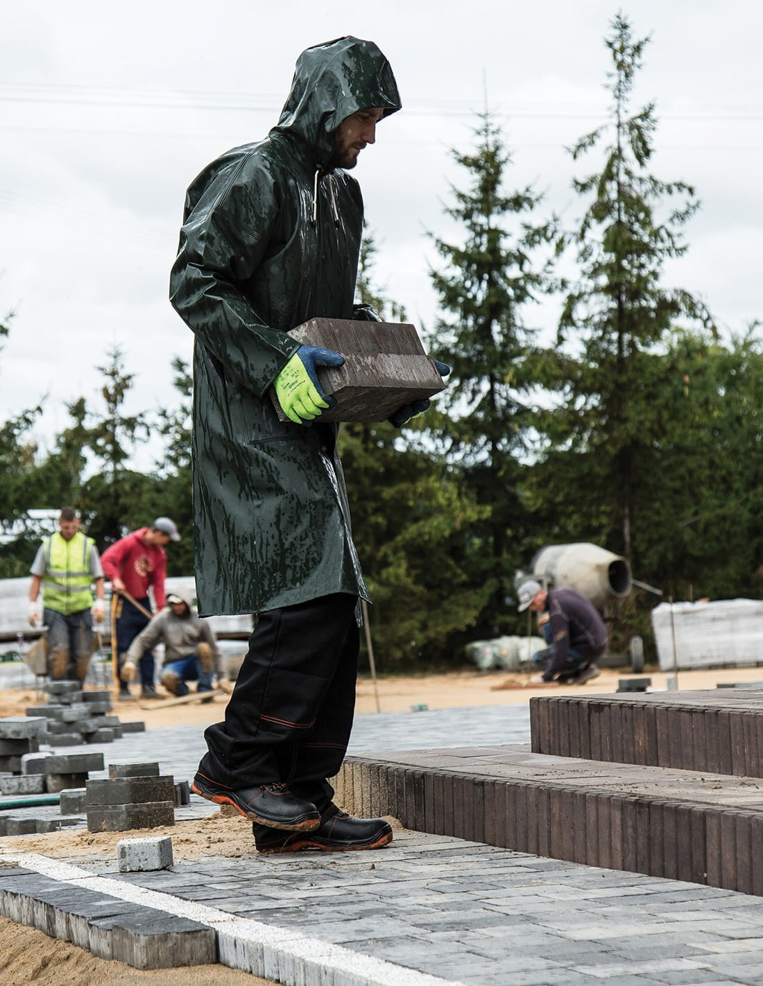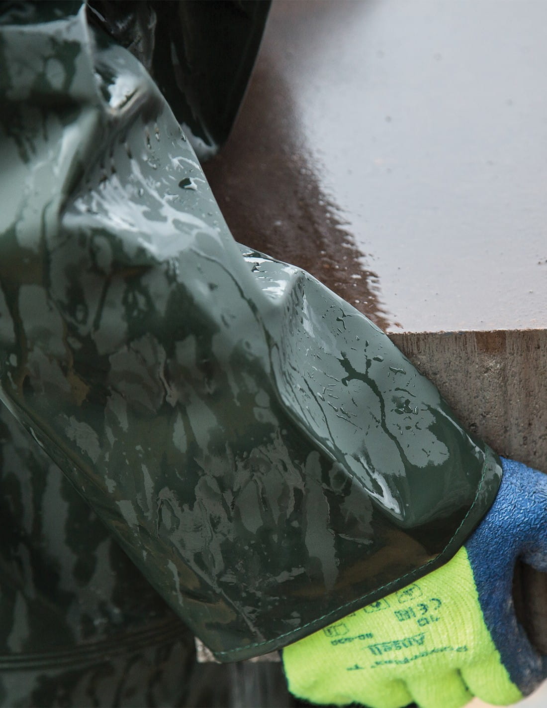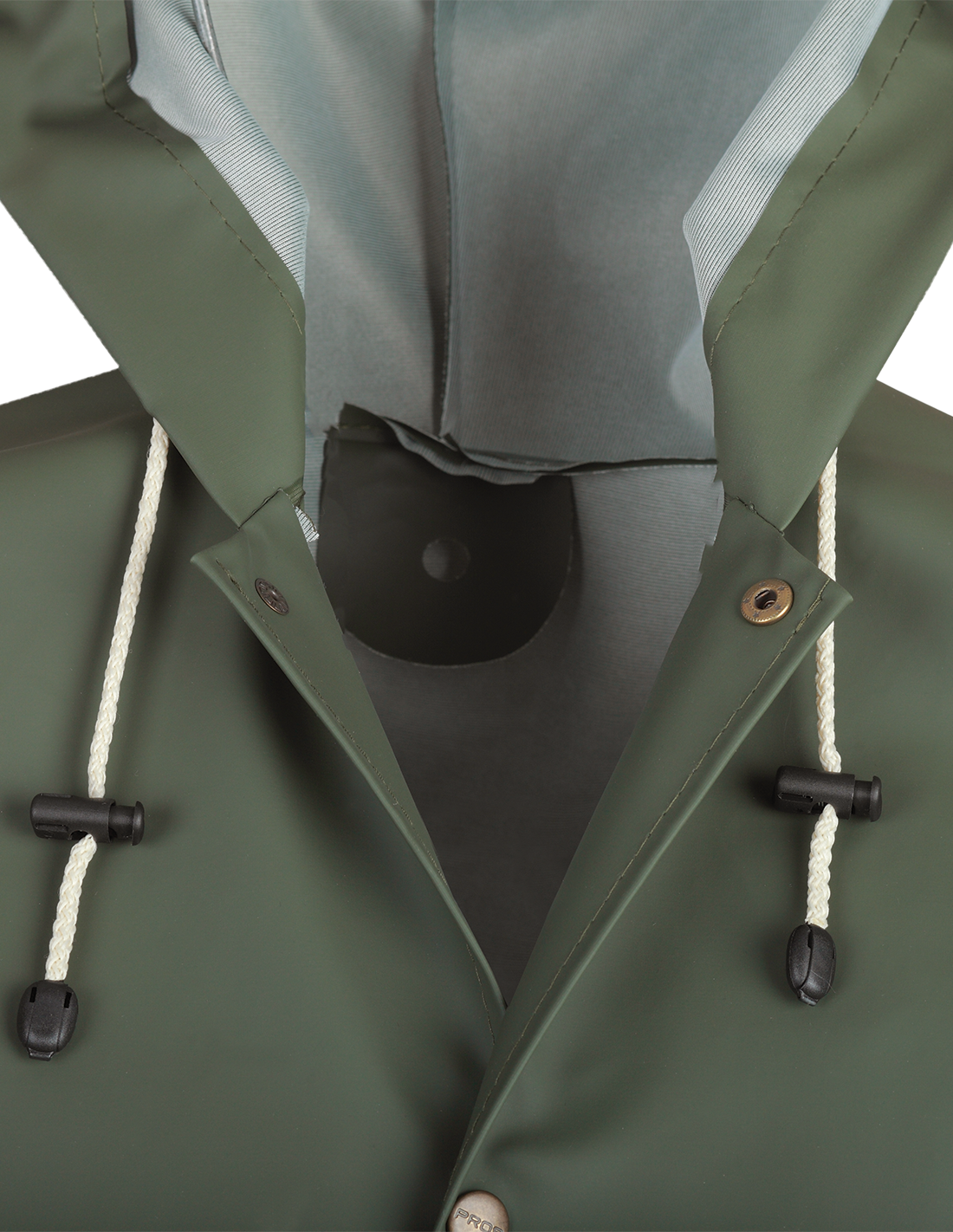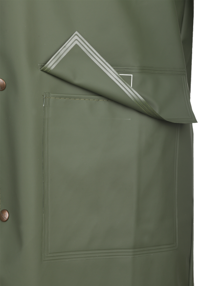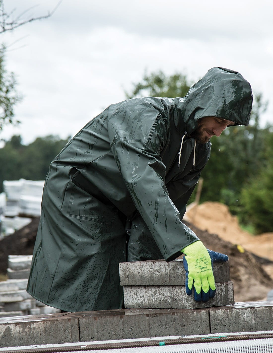 Zwiększona długość chroni uda i kolana przed przemoczeniem. Płaszcz zapinany na napy, z kapturem i dwiema bocznymi kieszeniami przykrytymi patkami. Model produkowany z wodoochronnej tkaniny Plavitex, przeznaczony do użytku w niesprzyjających warunkach pogodowych. Zapewnia skuteczną ochronę przed wiatrem i deszczem. Technika obustronnego zgrzewania zwiększa wytrzymałość szwów. Produkt spełnia standardy europejskich norm: EN ISO 13688 i EN 343.