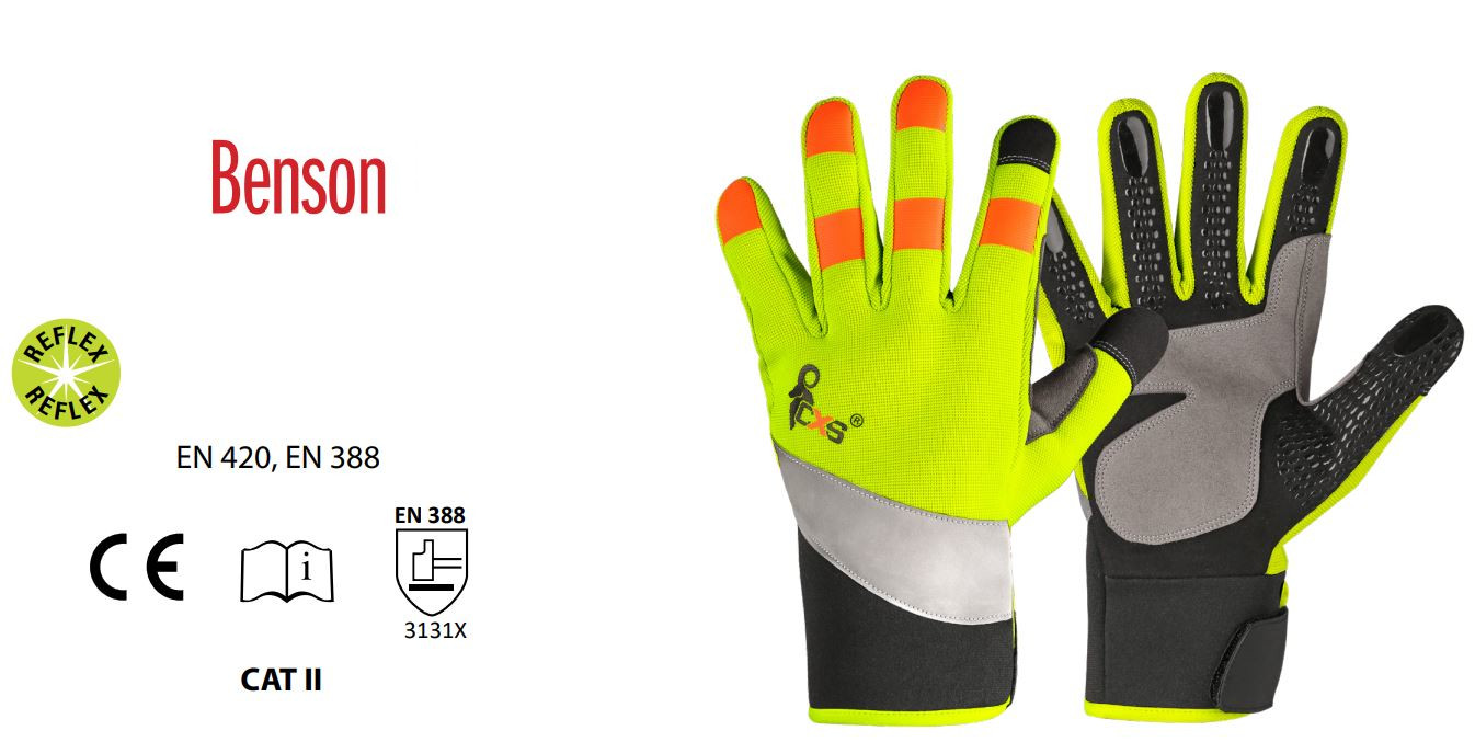Kombinowane rękawice z taśmą odblaskową i aplikacjami silikonowymi na palcach dla lepszego uchwytu i manipulacji. Dłoń ze skóry syntetycznej (mikrowłókno). Rękawice są wygodne, nie kurczą się, nie rozciągają i nie twradnieją. Grzbiet ze Spandexa z PU pasem odblaskowym. Neoprenowy mankiet na rzep łatwo dostosowuje się do nadgarstka. Opakowanie z blistrem.