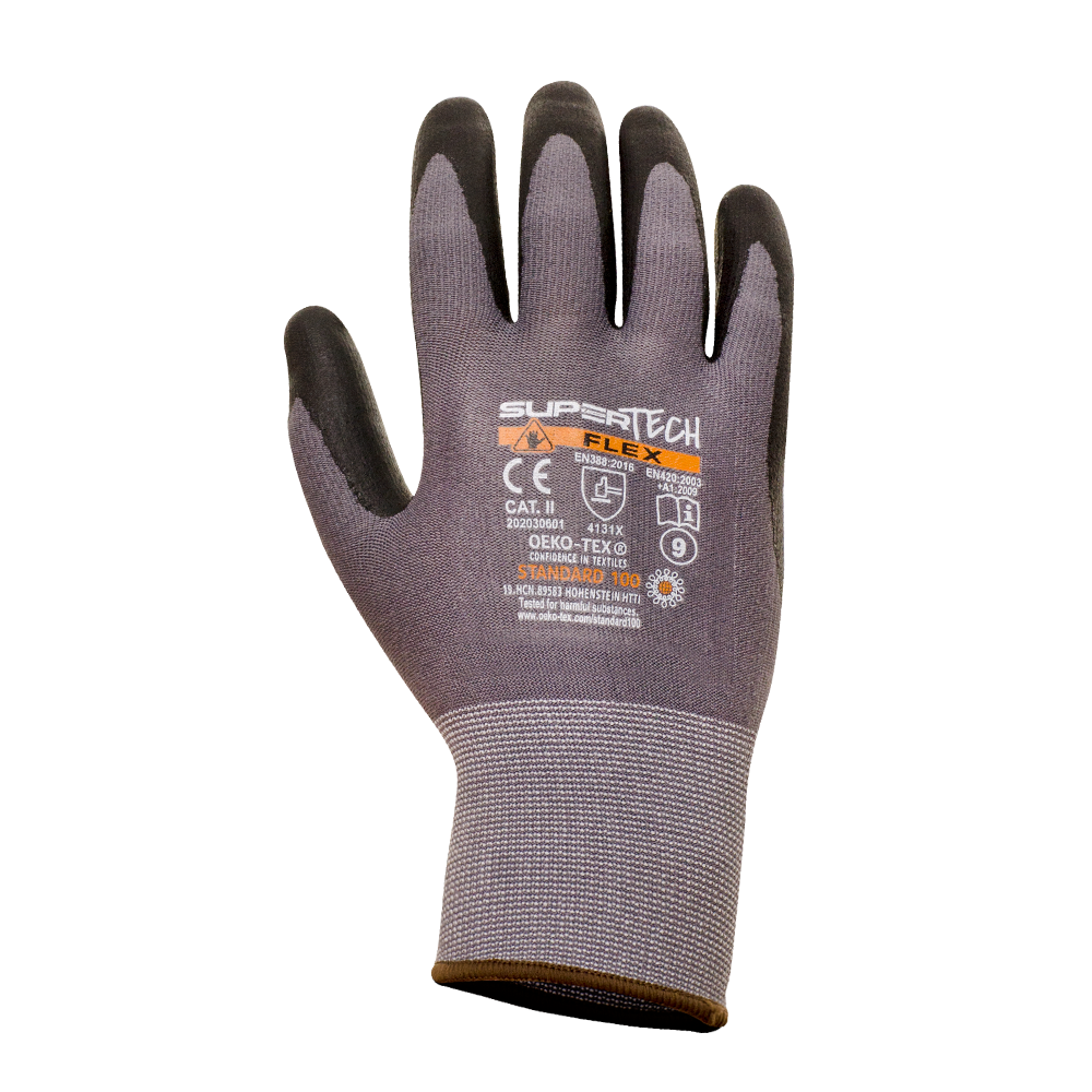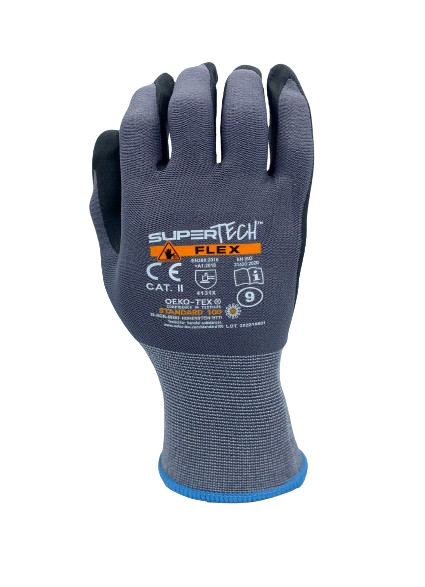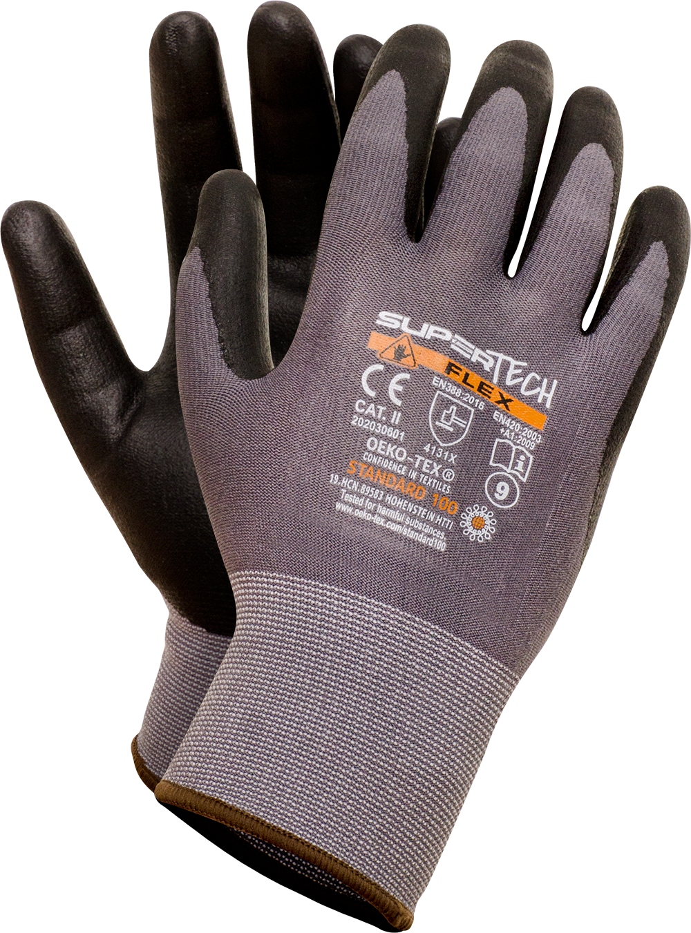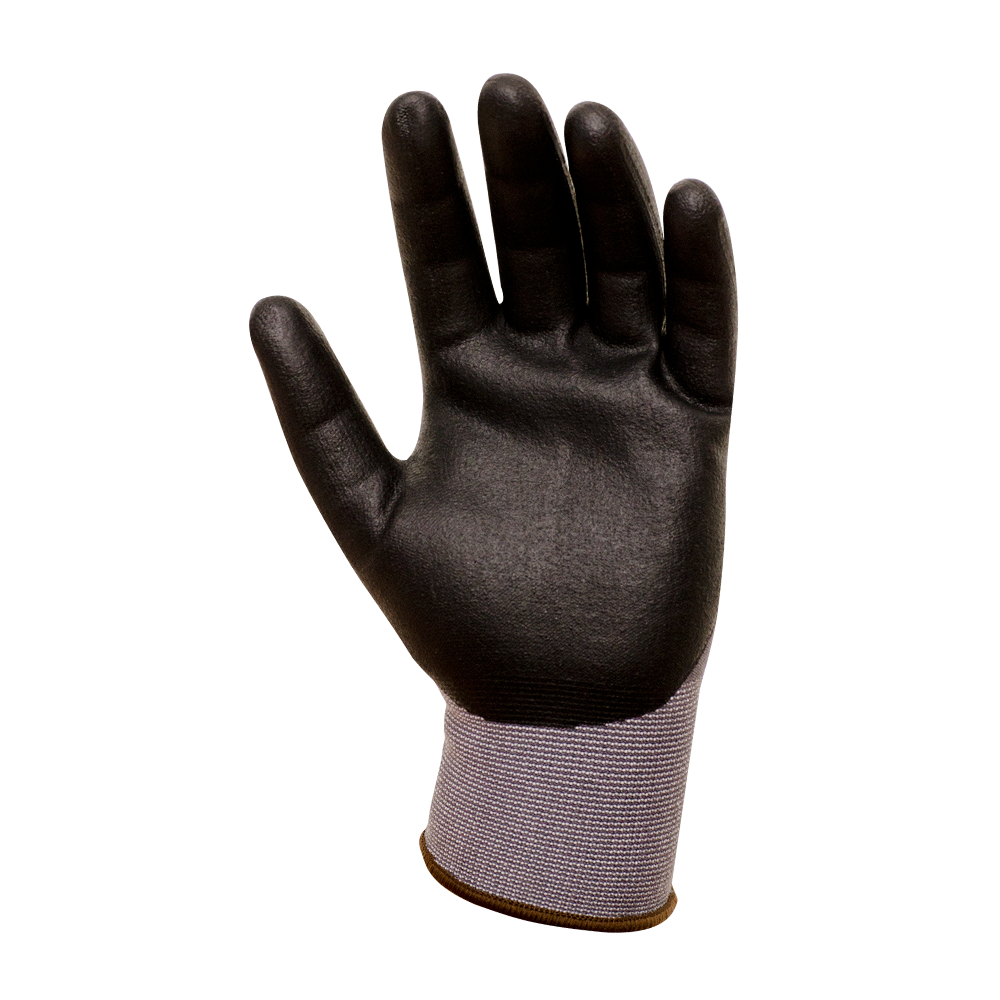 Rękawice ochronne, wykonane z nylonowej dzianiny w połączeniu ze spandexem (ścieg 15) w kolorze szarym, powlekane wysokiej jakości czarną mikropianką nitrylową, zakończone ściągaczem. Jest to 100% wysokiej jakości guma nitrylowa importowana z Niemiec (kauczuk nitrylowo-butadienowy NBR).