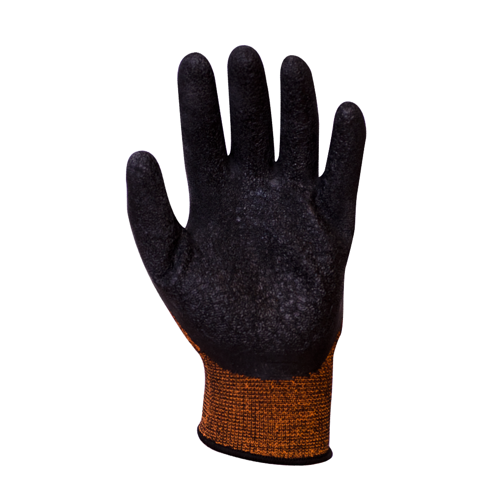 Bezszwowe rękawice ochronne, wykonane z dzianiny poliestrowej w połączeniu ze spandexem (ścieg 13), co gwarantuje elastyczność i idealne dopasowanie do dłoni, zapewniając lepszą ochronę, przewiewność i większy zakres wykonywanych ruchów. Powlekane marszczonym lateksem w kolorze czarnym.