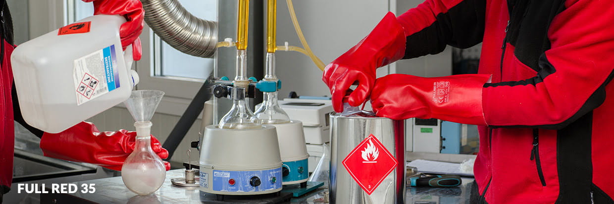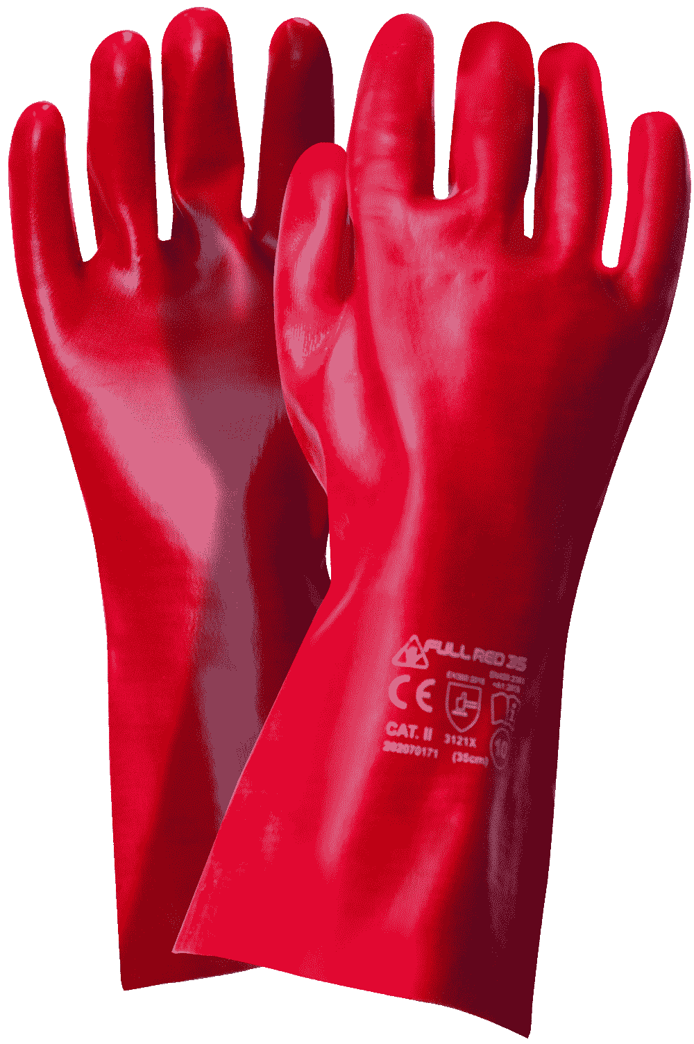 Rękawice ochronne wykonane na wkładzie z dzianiny bawełnianej. W całości powlekane warstwą PVC w kolorze czerwonym, zakończone oblanym mankietem, dzięki czemu rękawica osiąga długość 35cm. Miękka i elastyczna powłoka pozwala na manualny chwyt.