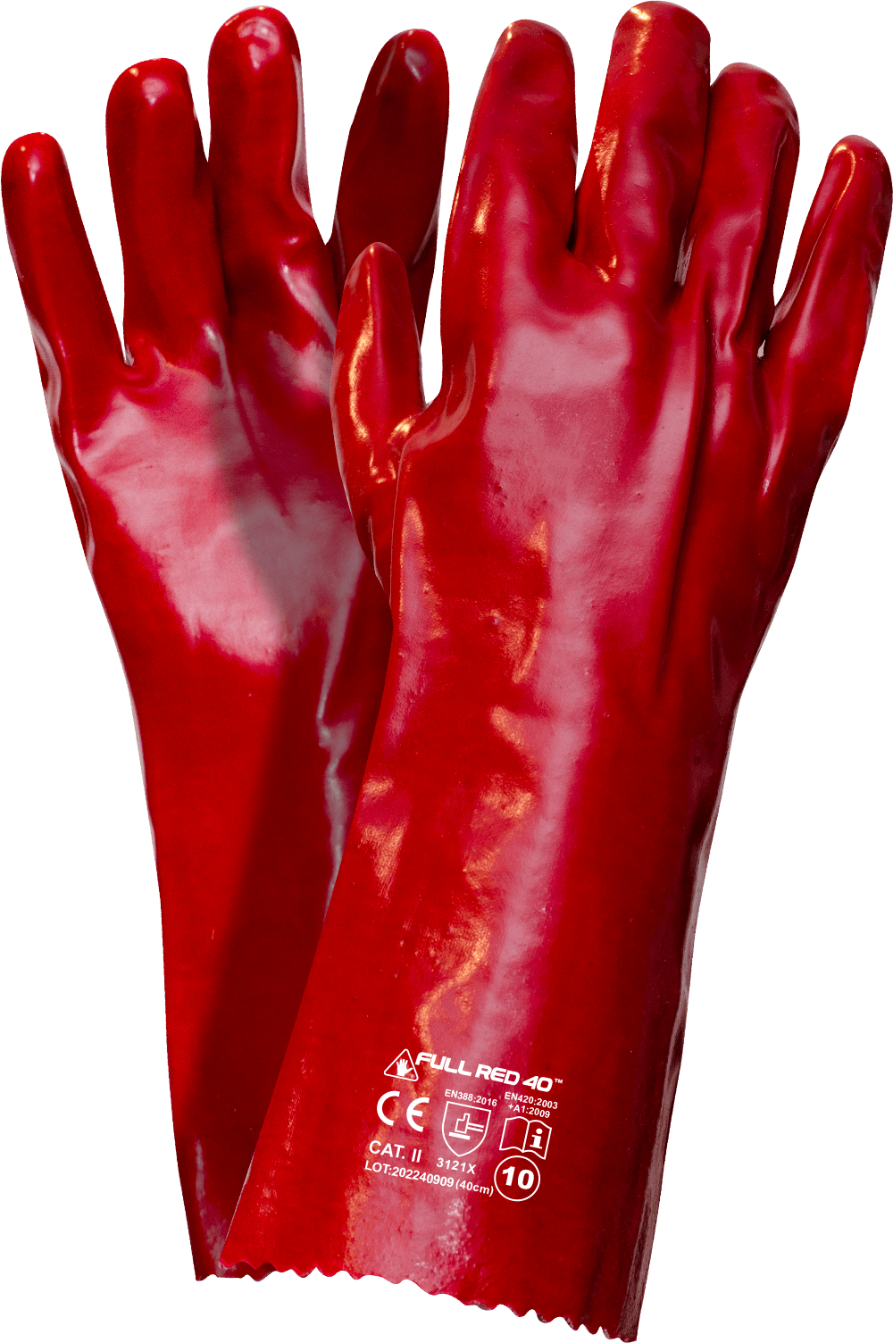 Rękawice ochronne wykonane na wkładzie z dzianiny bawełnianej. W całości powlekane warstwą PVC w kolorze czerwonym, zakończone oblanym mankietem, dzięki czemu rękawica osiąga długość 40cm. Miękka i elastyczna powłoka pozwala na manualny chwyt.