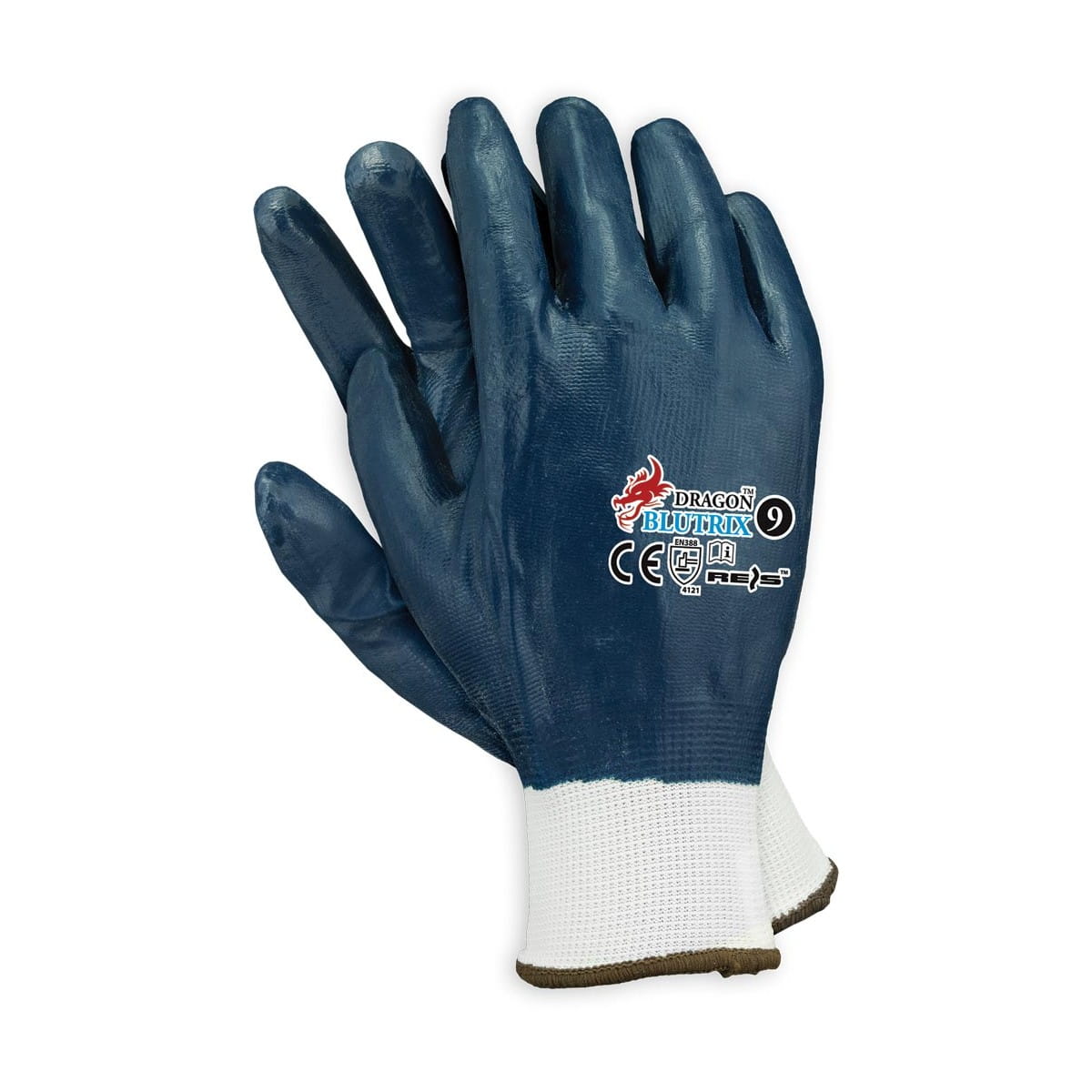 Rękawice ochronne wykonane z poliestru, powlekane nitrylem, zakończone ściągaczem.