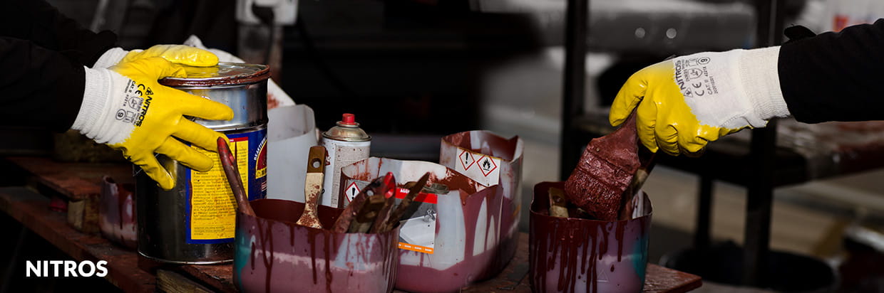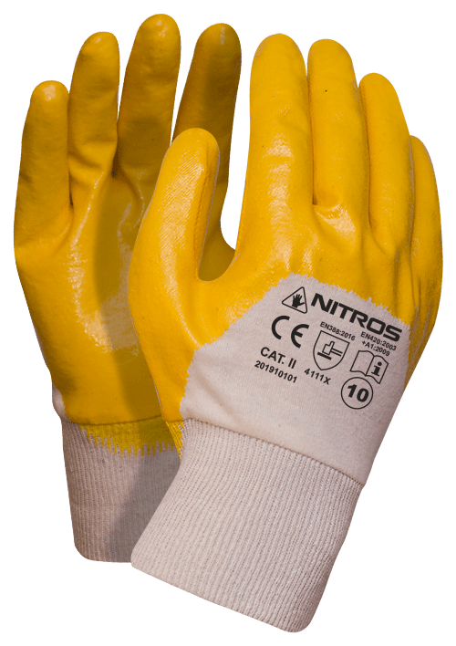 Rękawice głęboko powlekane żółtym nitrylem, do kości śródręcza, na bawełnianej dzianinie typu interlock, zakończone elastycznym ściągaczem.
