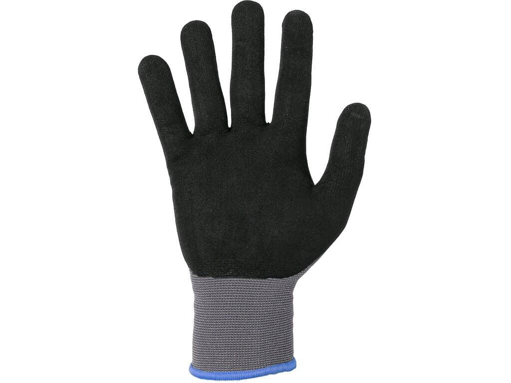 Bezszwowe rękawice robocze z elastycznej dzianiny nylonowej, w połowie powlekane mieszaniną spienionego nitrylu i poliuretanu na bazie wody, z wykończeniem piaskowym dla wygodniejszego uchwytu, odporność na ciepło kontaktowe do 100°C, elastyczny mankiet. Opakowanie z blistrem.