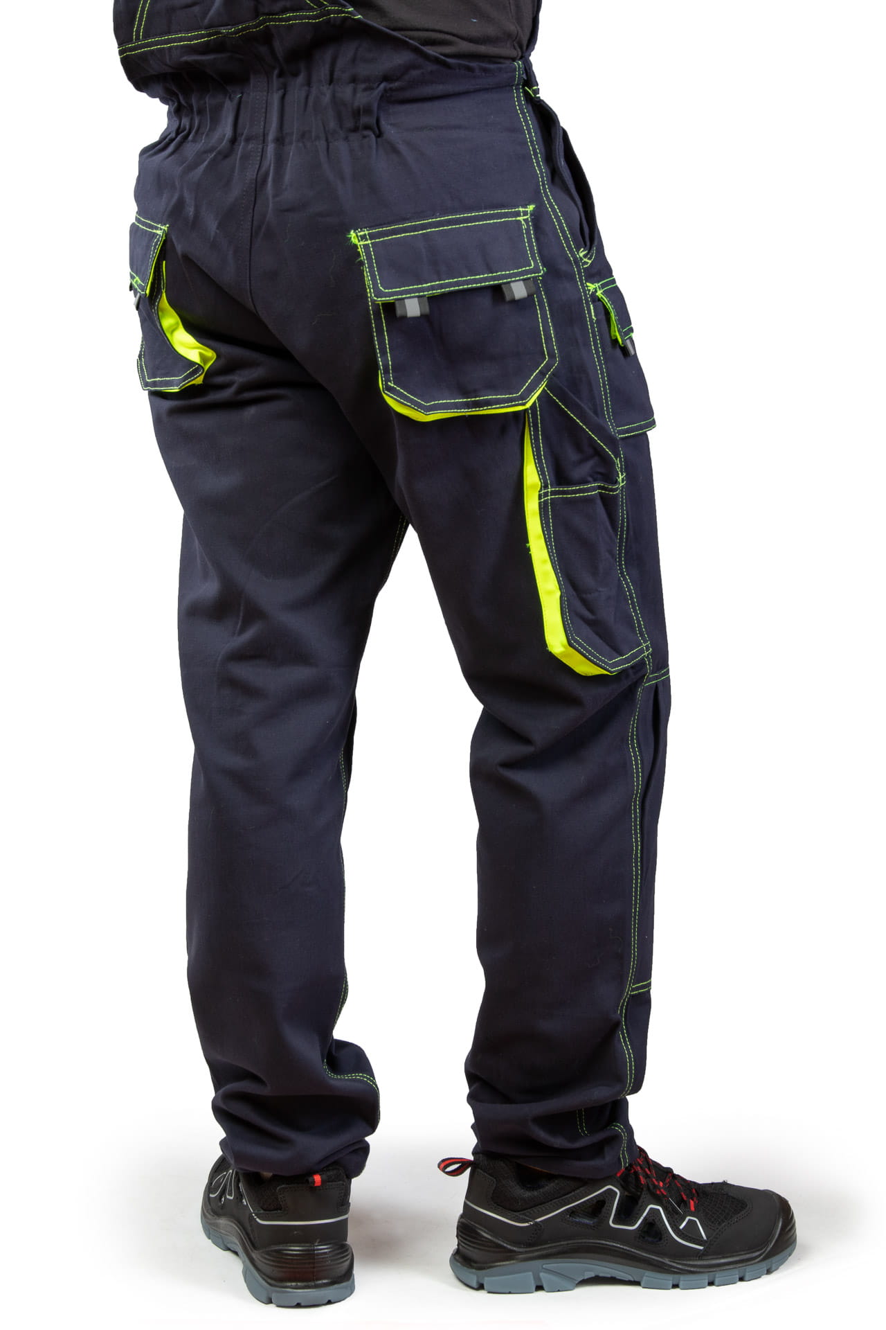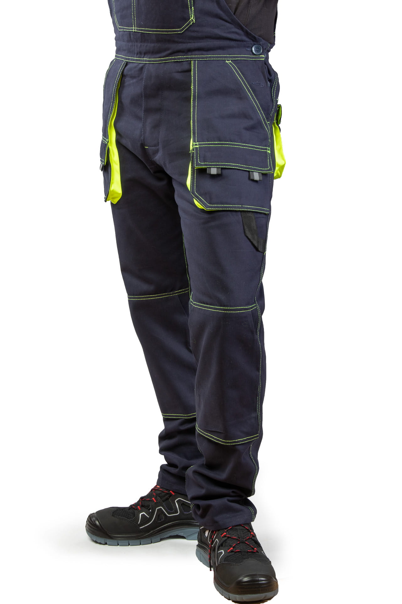 Kieszenie: przestrzenie kieszenie, dwie kieszenie boczne, wzmocnione kieszenie zapinane na rzep, kieszeń na komórkę, dwie kieszonki na długopisy, kieszeń na dokumenty, kieszeń na miarę „metrówkę”, ergonomiczna kieszeń na nakolanniki,