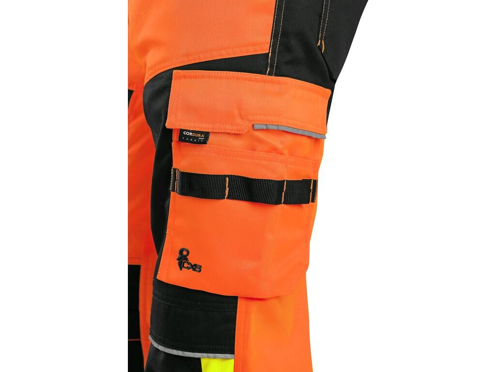 Pas ze szlufkami na pasek i z gumką po bokach. 2 kieszenie z przodu, 2 kieszenie z tyłu, jedna kieszeń z klapką, przykryte zapinanie na zamek, boczne kieszenie wielofunkcyjne, kieszeń na udzie z miejscem na ID kartę, kolana wzmocnione materiałem CORDURA z możliwością włożenia nakolanników, dół wzmocniony materiałem CORDURA, segmentowe paski odblaskowe (7cm szerokości), kontrastujące żółte/pomarańczowe i odblaskowe elementy. Zalecane zastosowanie: budownictwo, prace drogowe, utrzymanie, logistyka, transport lotniczy i morski.