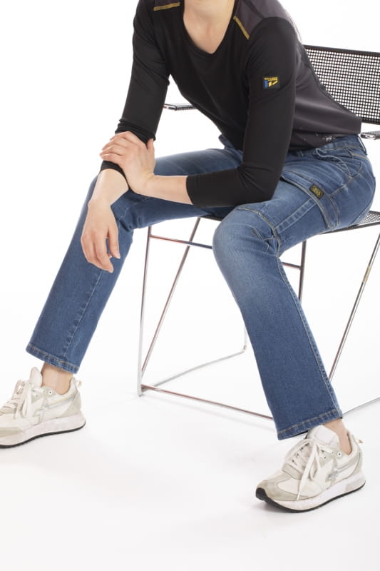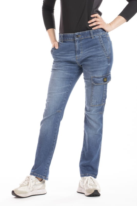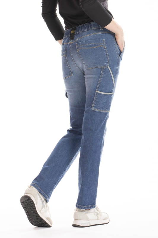 Dżinsy robocze z wieloma kieszeniami o kobiecym i nowoczesnym kroju, zaokrąglone w biodrach, z prostą nogawką i wygodne w kolanach. Niewidoczny elastyczny pas z możliwością personalizacji, który zapobiega zsuwaniu się spodni. Duże kieszenie z przodu i z tyłu oraz boczna kieszeń na miarkę