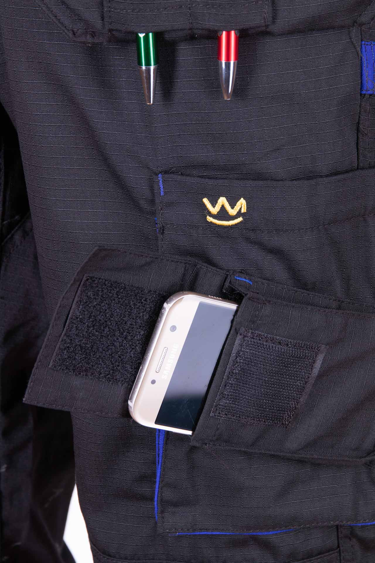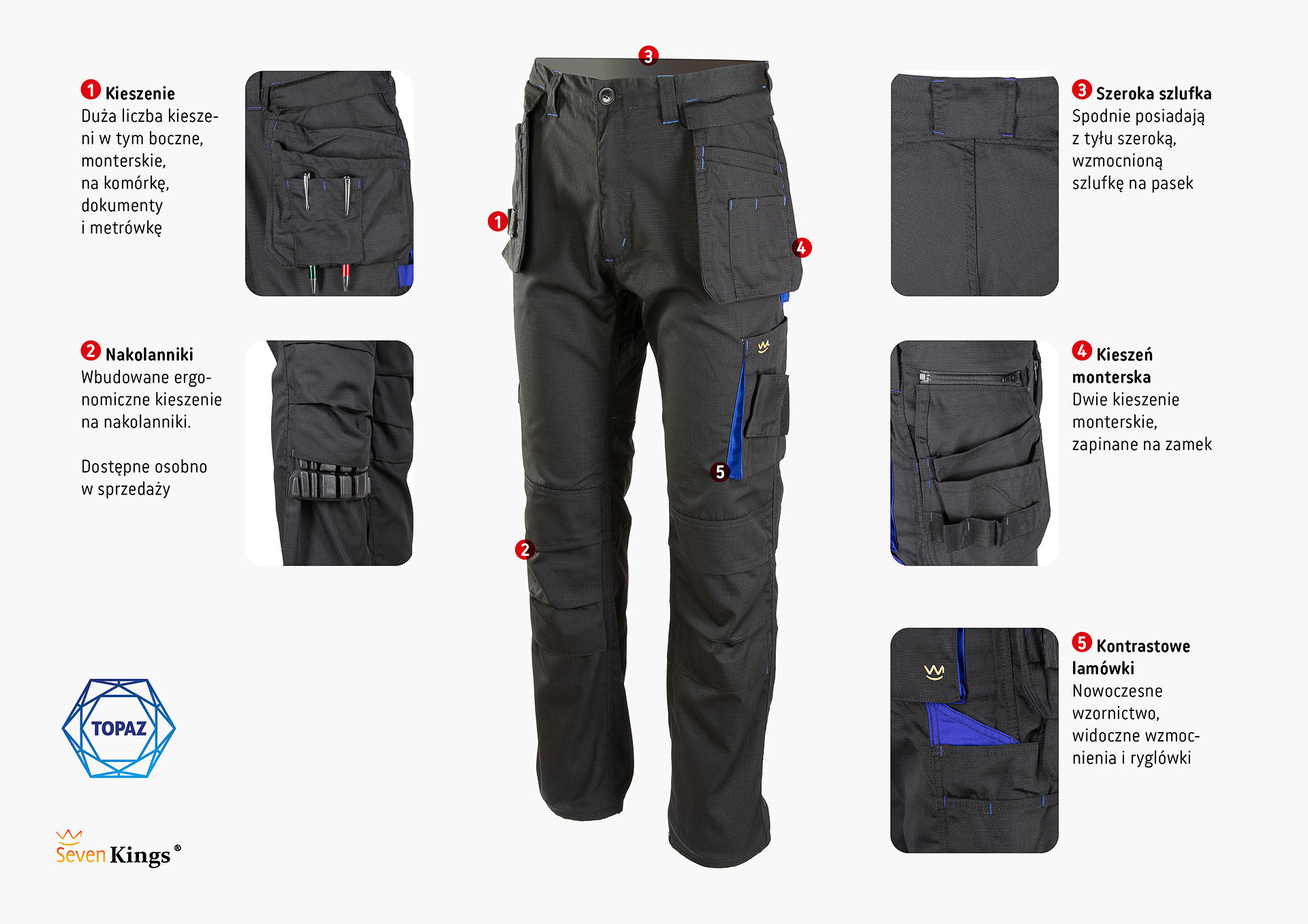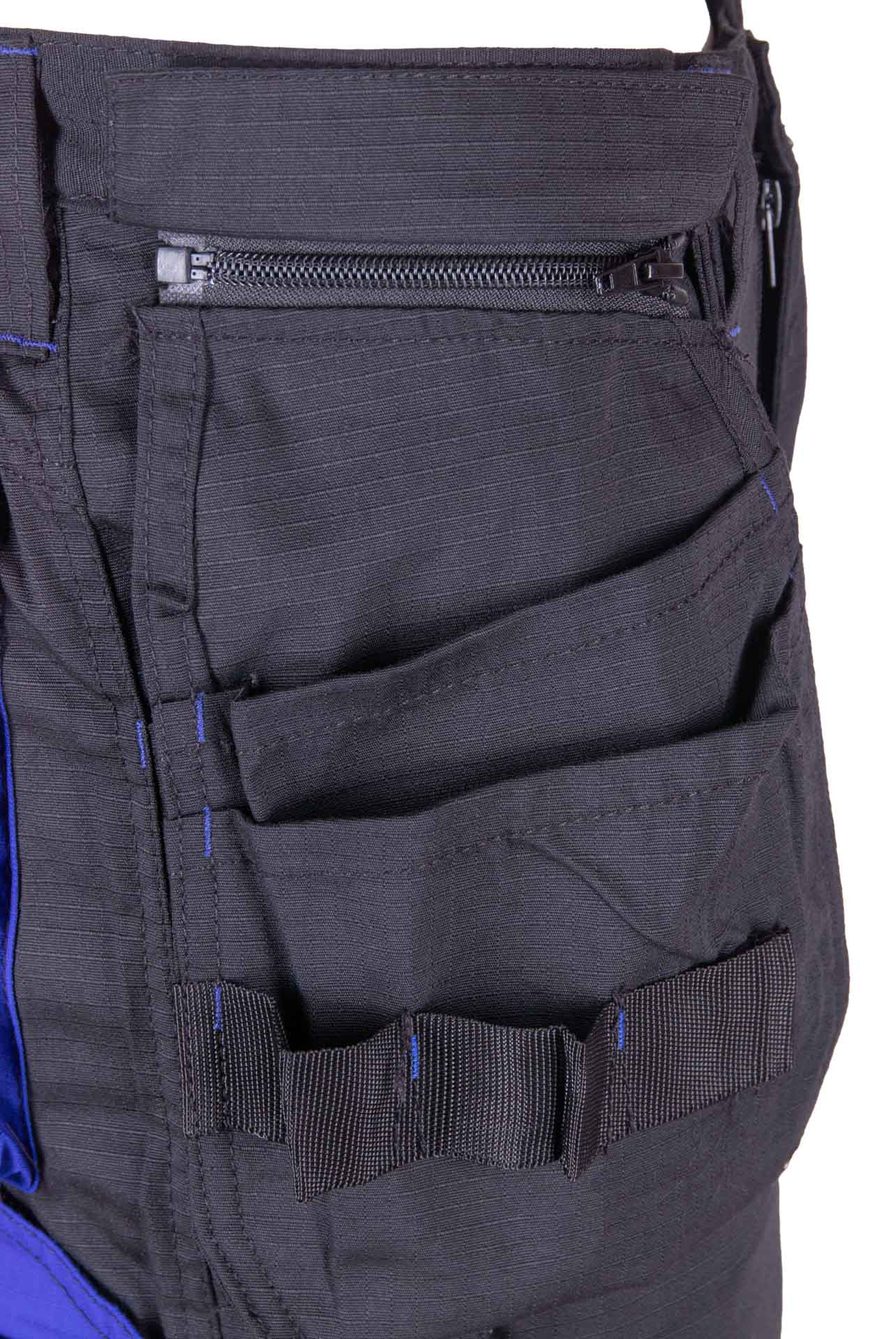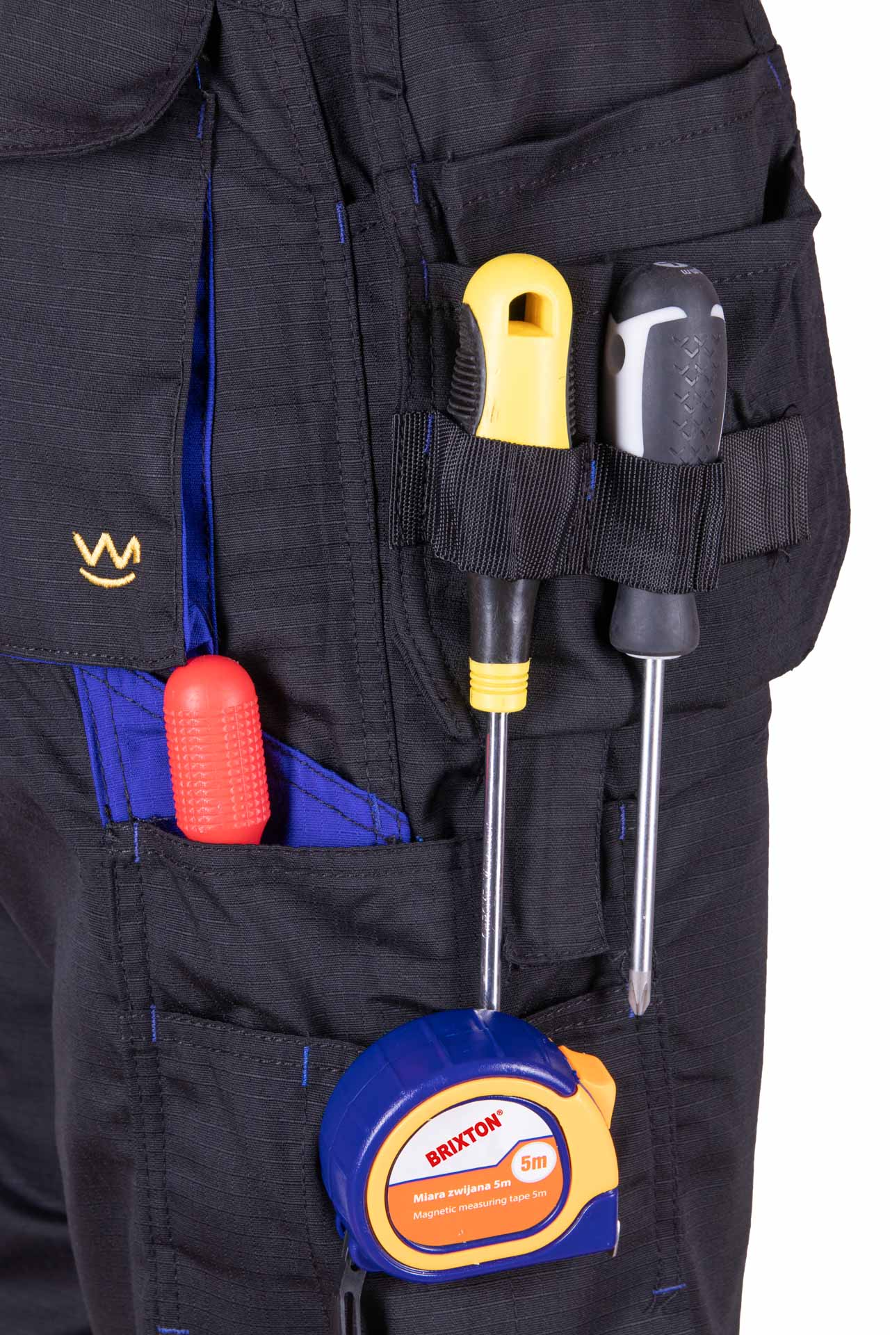 Kieszenie: dwie kieszenie w tylnej części spodni, przestrzenne kieszenie, dwie kieszenie boczne, wzmocnione kieszenie zapinane na rzepy, kieszeń na komórkę, kieszeń na dokumenty, kieszeń na dokumenty, kieszeń na miarę „metrówkę”, ergonomiczna kieszeń na nakolanniki, dwie kieszenie monterskie, dopinane na zamek,