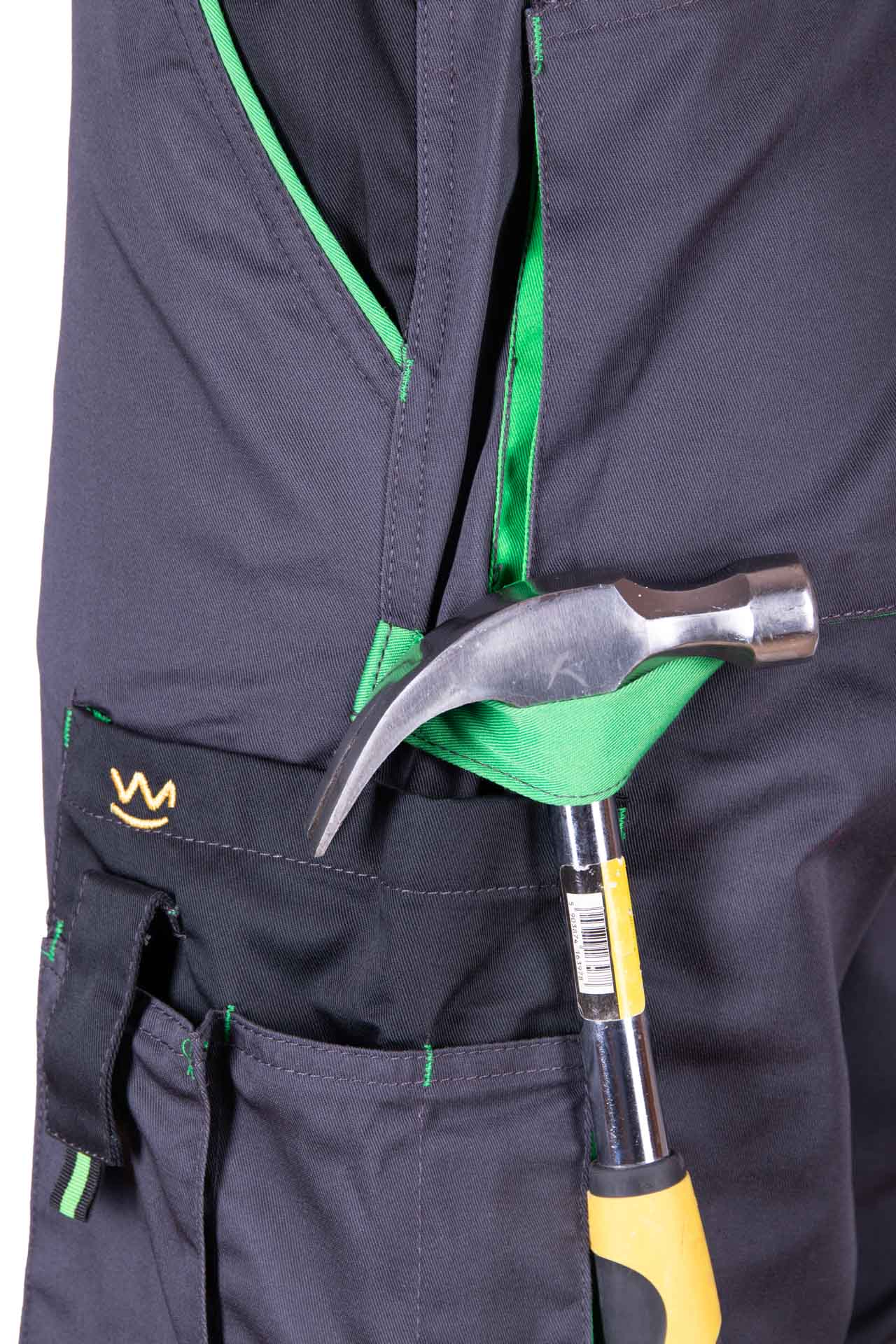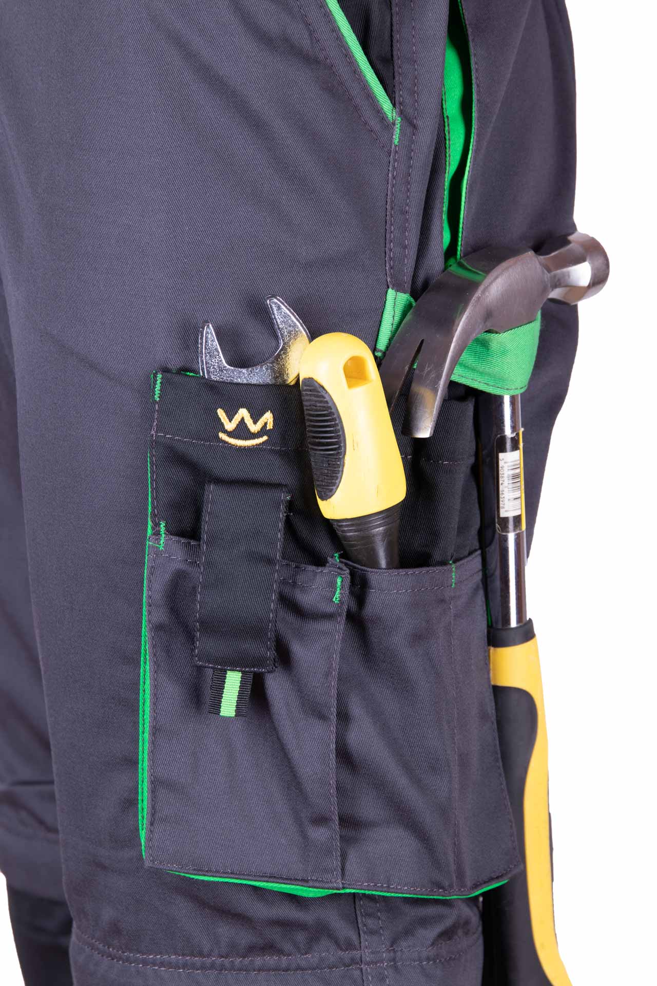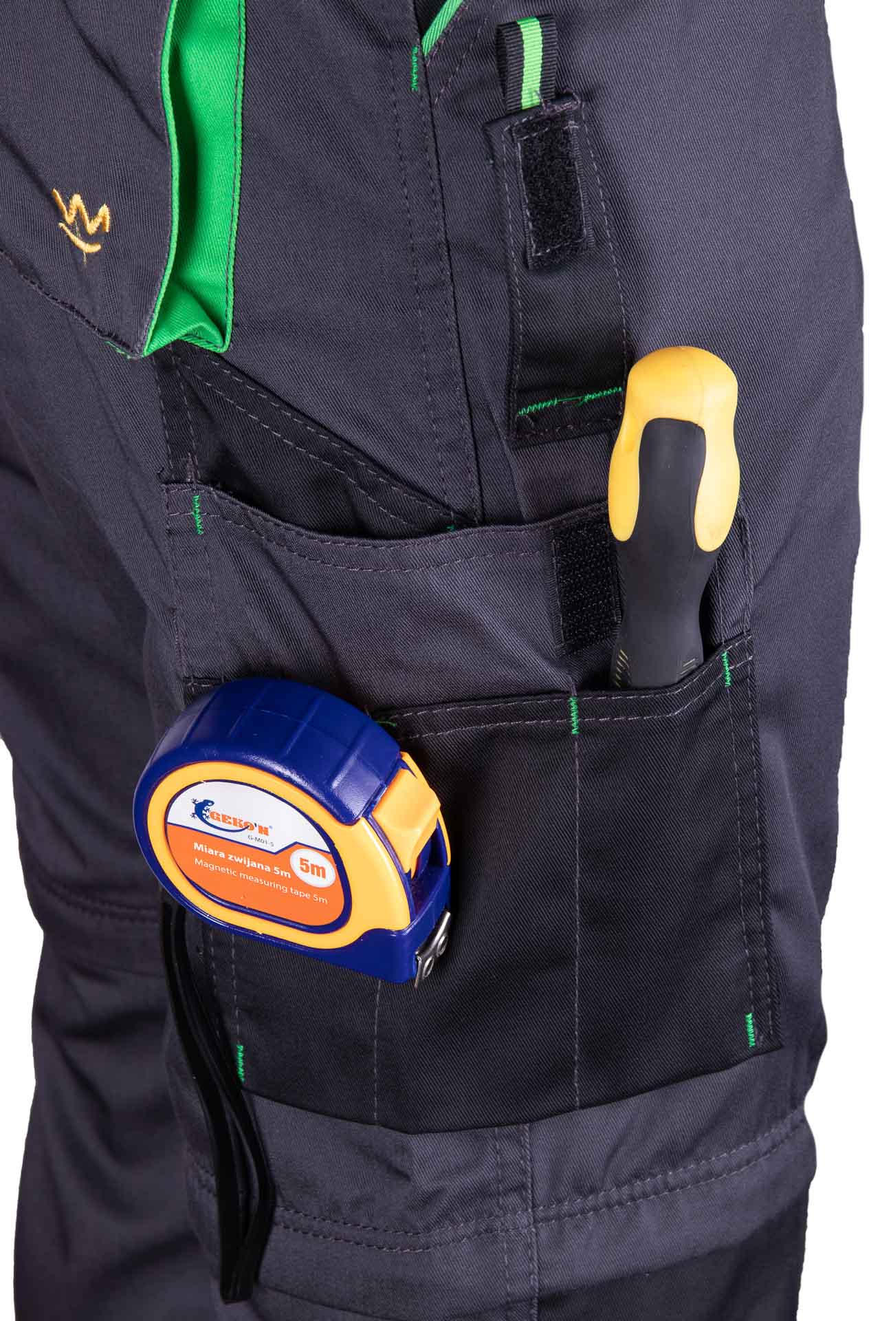 Kieszenie: dwie kieszenie w tylnej części spodni, wzmocnione kieszenie boczne, kieszeń na komórkę, kieszeń na dokumenty, kieszeń na miarę „metrówkę”, ergonomiczna kieszeń na nakolanniki,