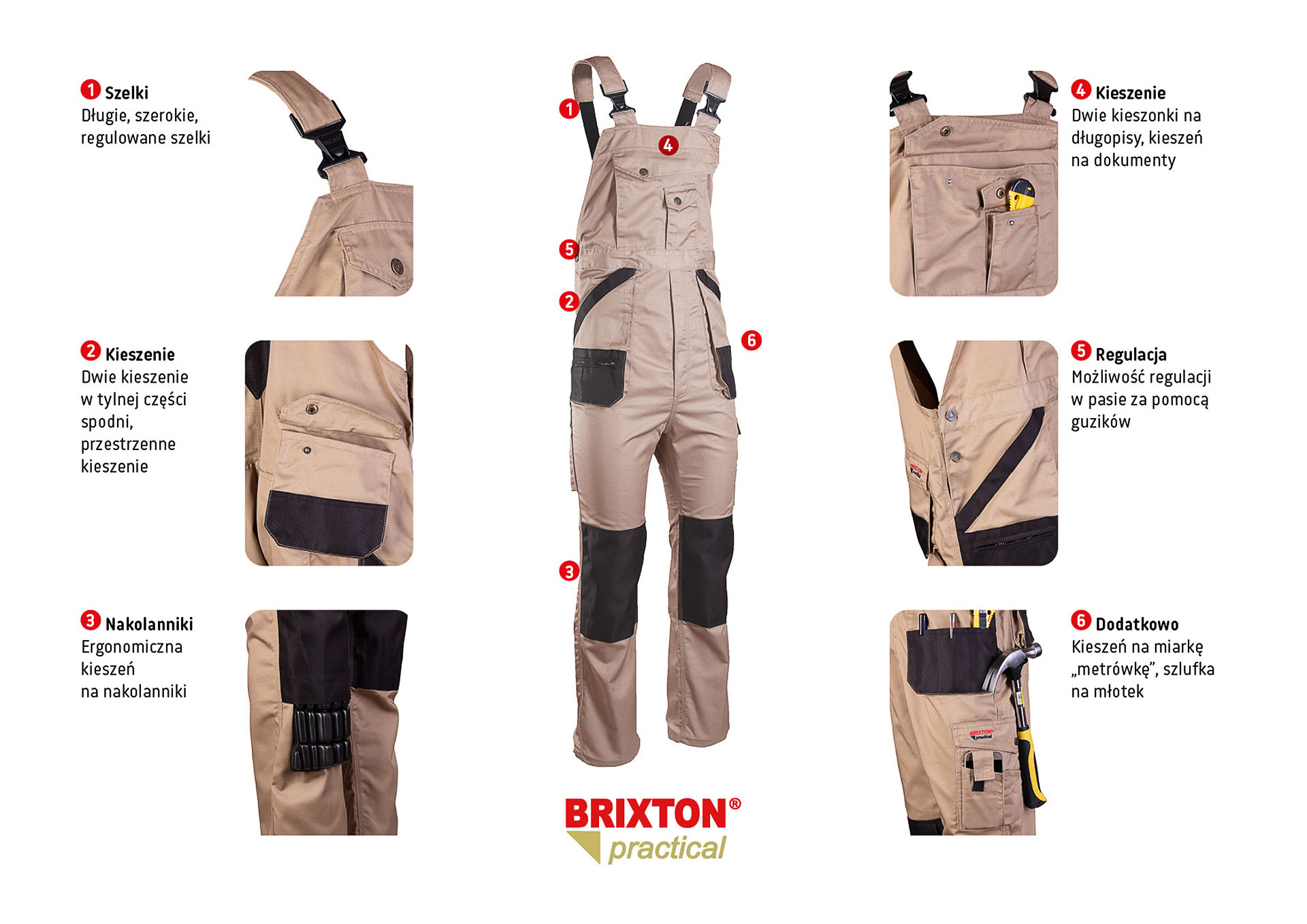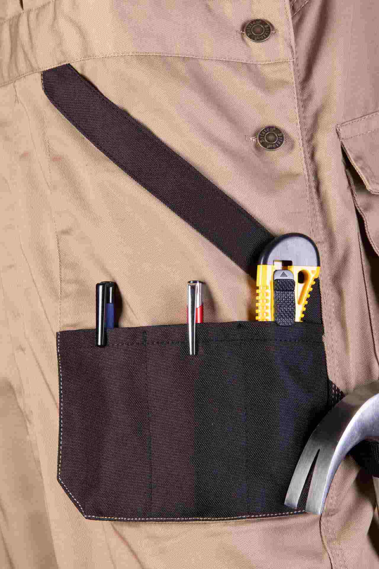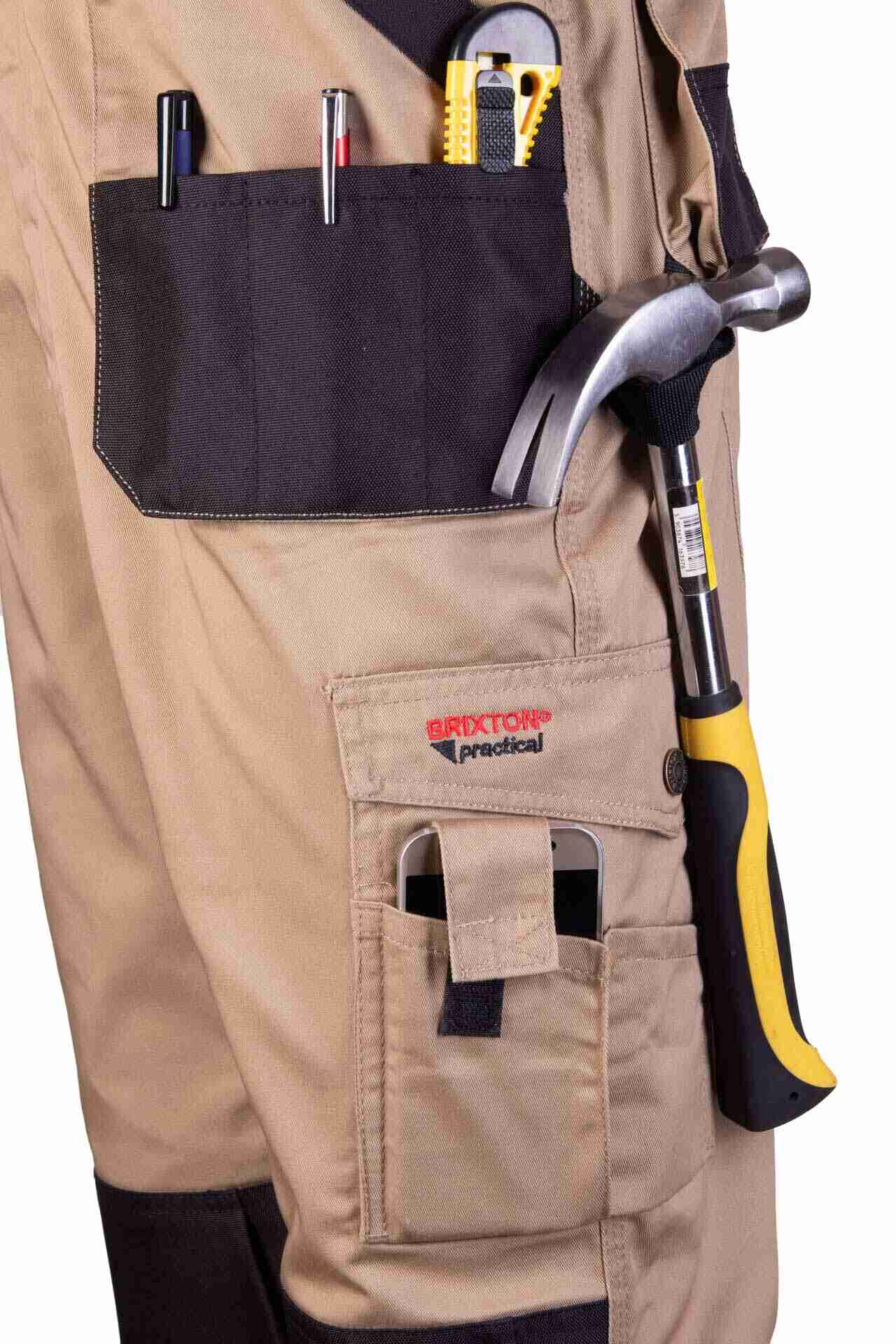 Model ma wiele funkcjonalnych kieszeni, które ułatwiają pracę w warsztacie, magazynie oraz na budowie. Spodnie posiadają kieszeń na zamek, dwie kieszenie tylne, a także przestrzenne kieszenie boczne. Dodatkowo zastosowano wzmocnione kieszenie boczne, kieszeń na miarę „metrówkę”, dwie kieszenie na długopisy oraz kieszeń na telefon. Ergonomiczna kieszeń na nakolanniki wykonana jest z wytrzymałego materiału Oxford, co zwiększa odporność na uszkodzenia podczas pracy w pozycji klęczącej.