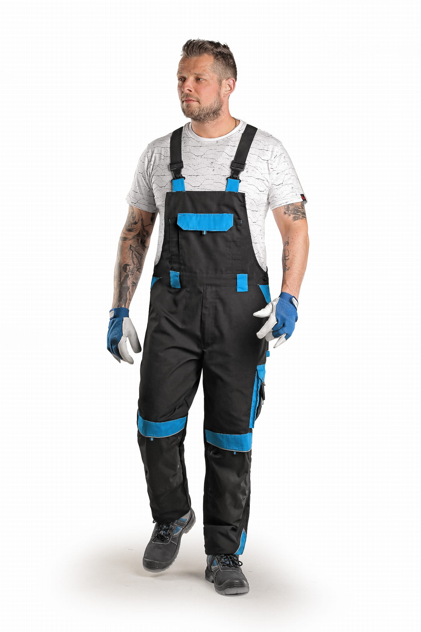 Męskie ogrodniczki robocze, kieszeń na piersi z patką, pas ze szlufkami na pasek, z tyłu guma z guzikiem do dostosowania rozmiaru, kieszenie klinowe z przodu, kieszenie wielofunkcyjne z obu stron, kolana wzmocnione 600D poliestrem z możliwością włożenia nakolanników, dwie kieszenie z patkami, szelki z gumą w tyle, elementy odblaskowe. Zalecane zastosowanie: budownictwo, inżynieria, przemysł lekki, prace drogowe, usługi holownicze, przemysł samochodowy, logistyka, magazyn, spedycja, garaż, konserwacja, montaż, rolnictwo, ogród, hobby.