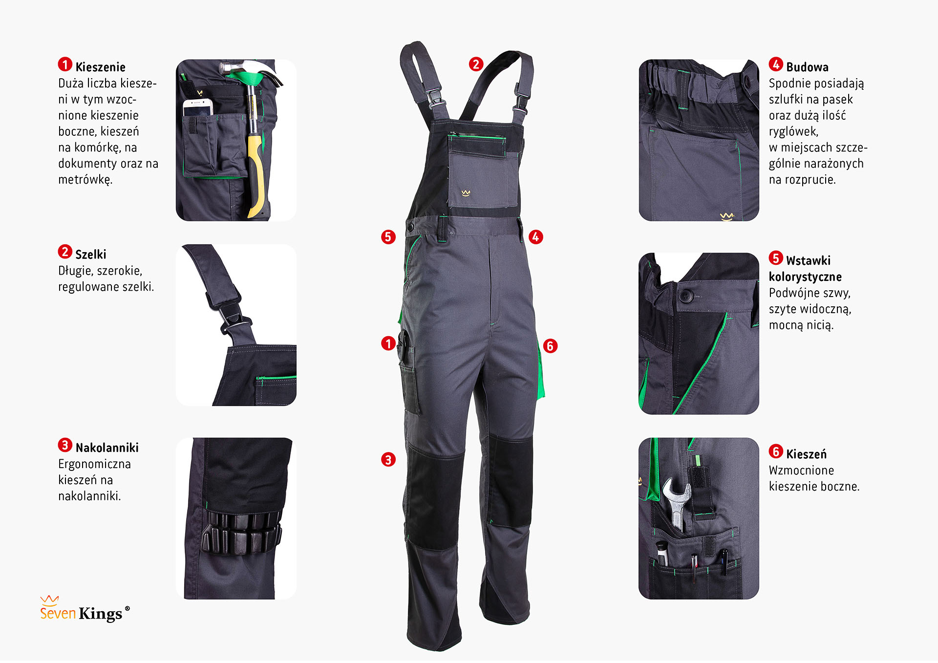 Spodnie robocze męskie ogrodniczki Seven Kings Onyx to odzież zaprojektowana dla osób, które potrzebują niezawodności, a także komfortu podczas wielogodzinnych zadań. Materiał o podwyższonej jakości utrzymuje swój kształt oraz kolor, co zapewnia długie użytkowanie bez utraty parametrów. Regulowane, szerokie szelki umożliwiają szybkie dopasowanie do sylwetki, a także stabilizują spodnie podczas intensywnych ruchów.