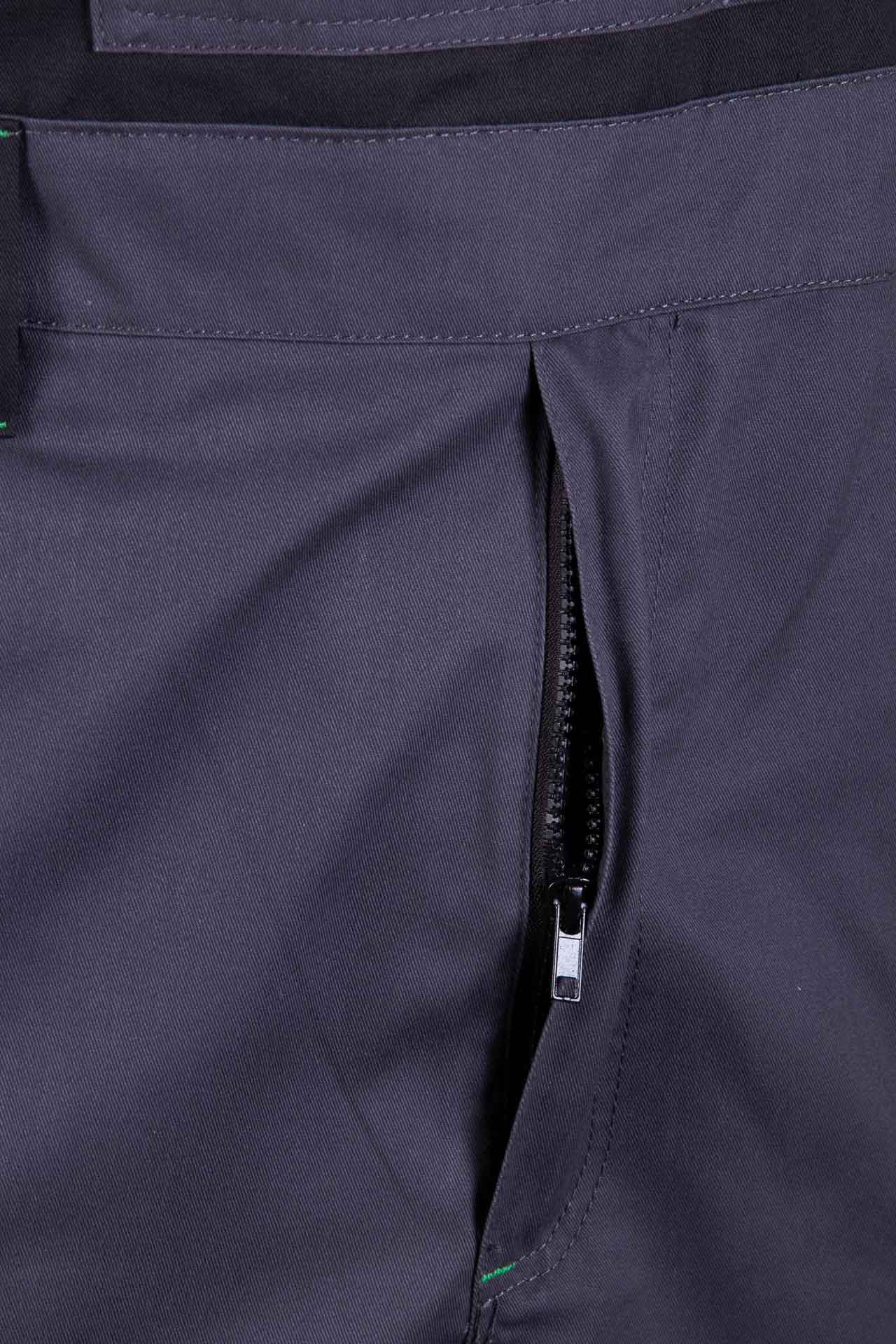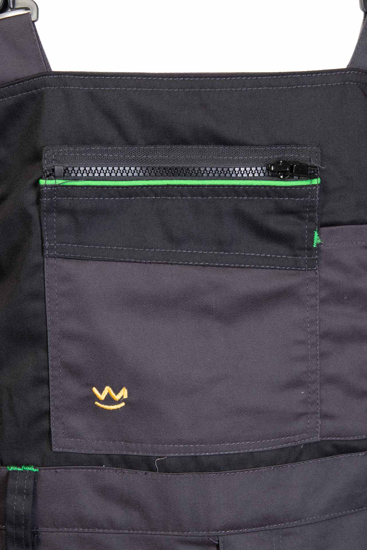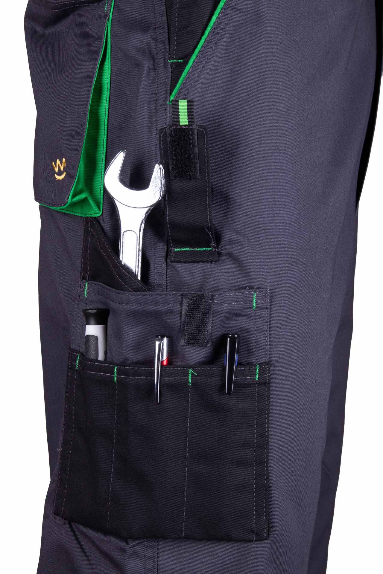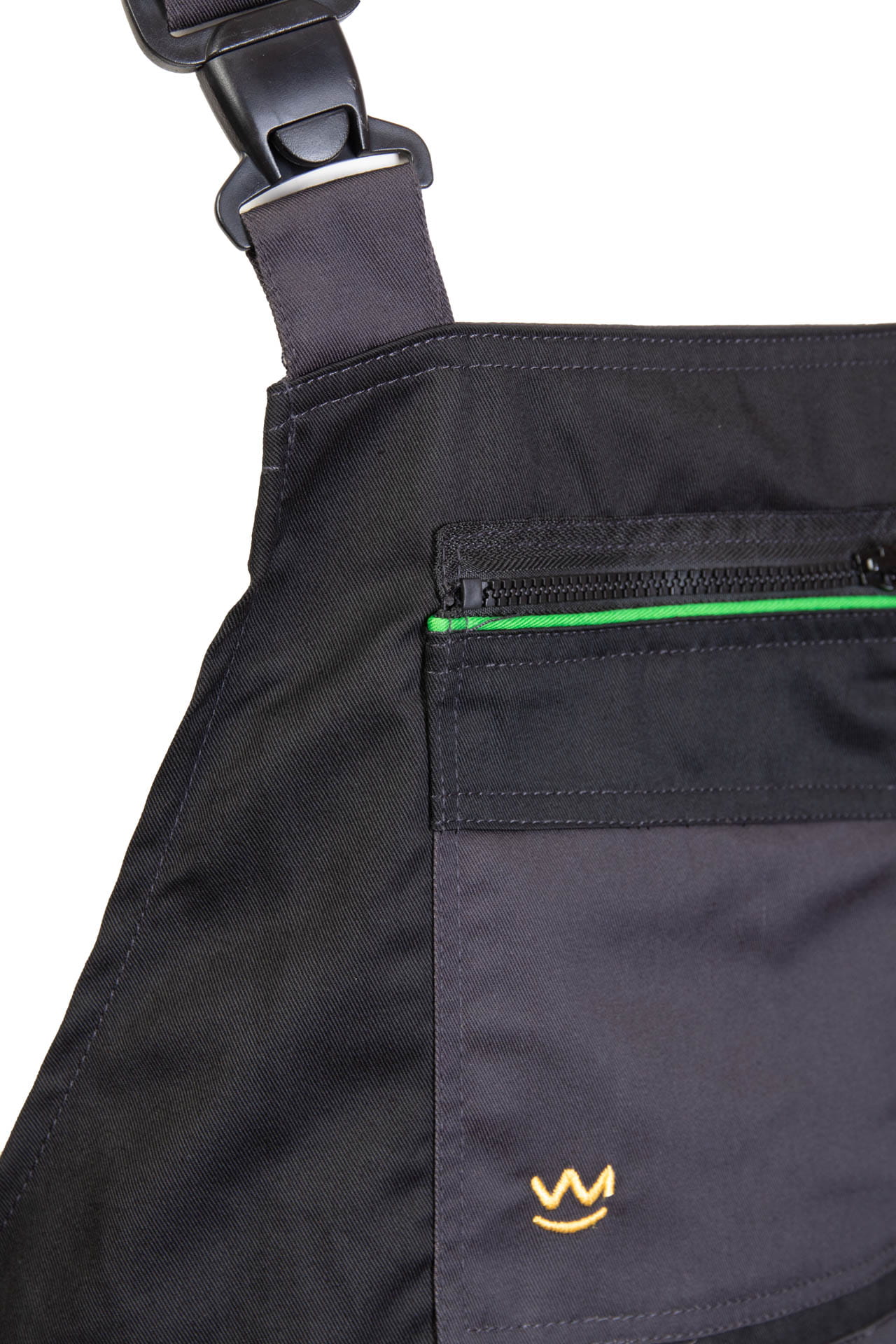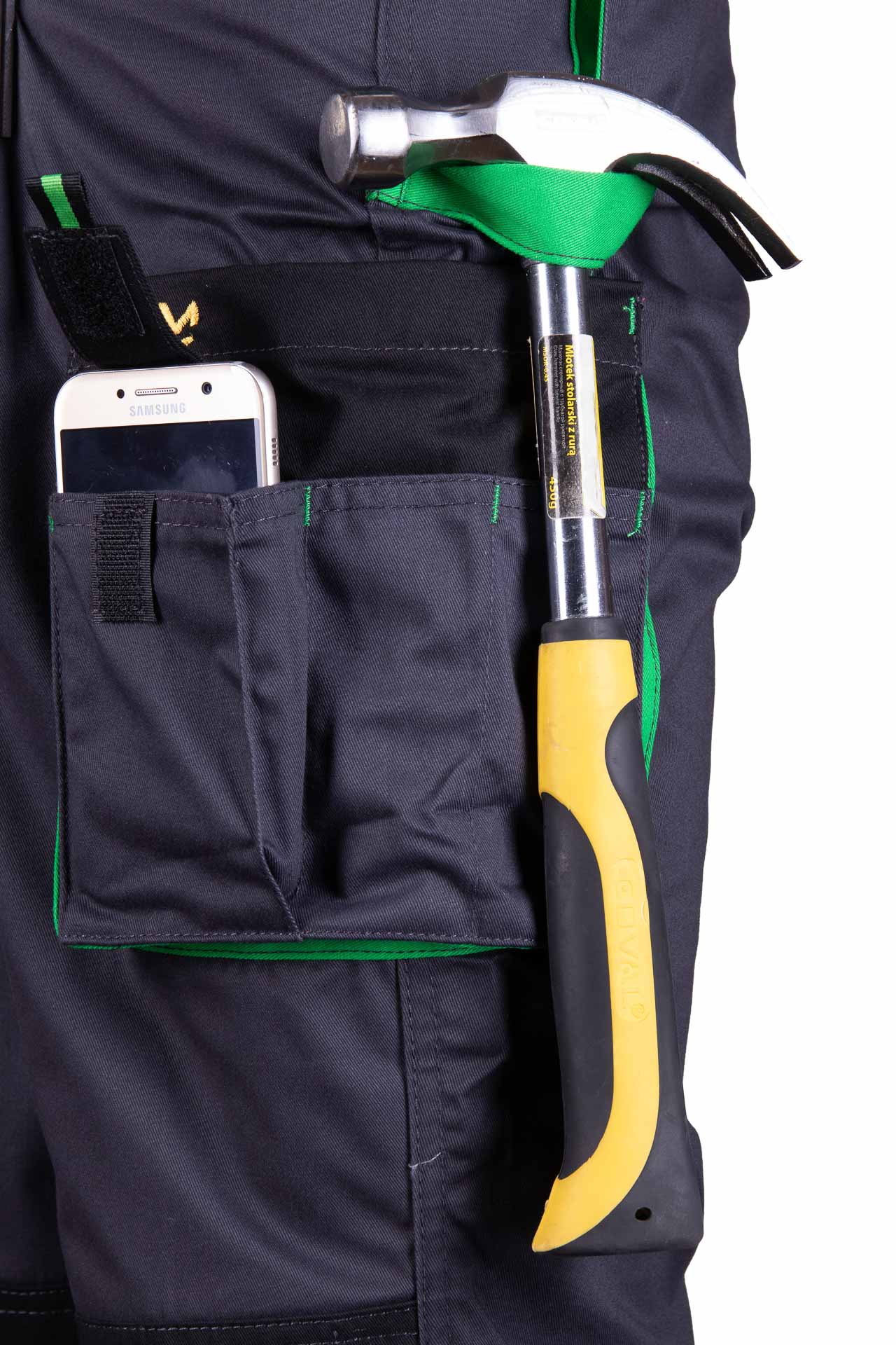 Ogrodniczki wyposażono w szereg praktycznych kieszeni, które pomagają utrzymać porządek. W tylnej części znajdują się dwie pojemne kieszenie, a boczne kieszenie zostały dodatkowo wzmocnione. Do dyspozycji użytkownika jest także kieszeń na telefon, dwie kieszonki na długopisy, kieszeń na dokumenty oraz kieszeń na miarkę. Ergonomiczna kieszeń na nakolanniki wspiera ochronę kolan, co ma duże znaczenie podczas pracy wymagającej częstego klękania.