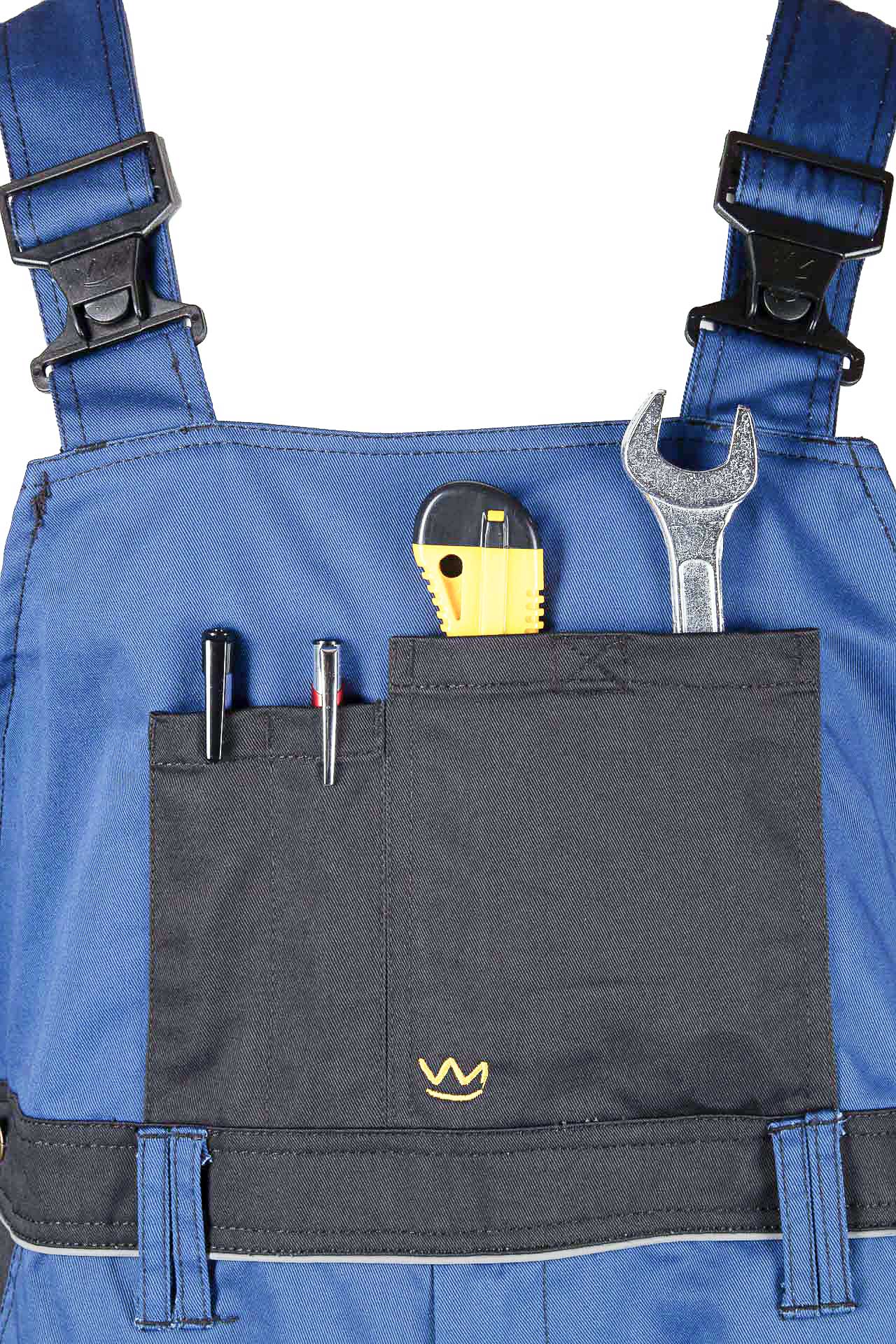Spodnie robocze męskie ogrodniczki Seven Kings Saphir wyróżniają się wysoką trwałością, a także wygodą, która ma znaczenie przy długich godzinach wykonywania obowiązków. Tkanina o podwyższonej jakości zachowuje stabilny rozmiar po wielu praniach, co zapewnia długie i niezawodne użytkowanie. Długie oraz szerokie szelki umożliwiają precyzyjne dopasowanie spodni do sylwetki.