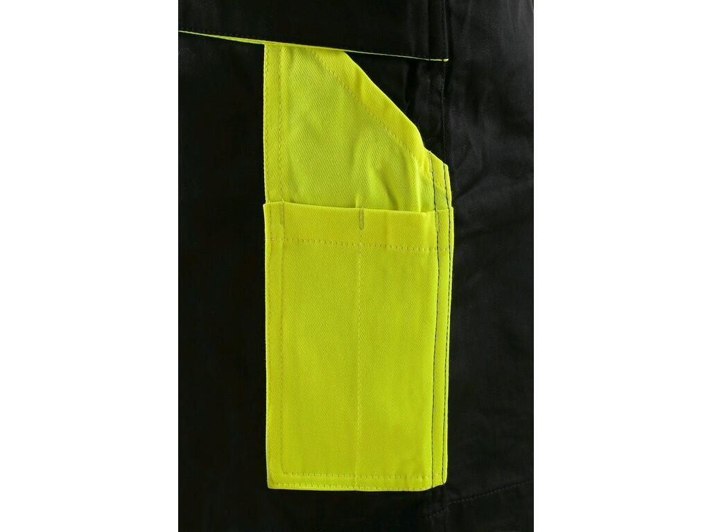 Męskie ogrodniczki robocze, ocieplone flanelą, kieszeń na piersi z patką, pas ze szlufkami na pasek, z tyłu guma z guzikiem do dostosowania rozmiaru, kieszenie klinowe z przodu, kieszenie wielofunkcyjne z obu stron, kolana wzmocnione 600D poliestrem z możliwością włożenia nakolanników, dwie kieszenie z patkami, szelki z gumą w tyle, elementy odblaskowe.